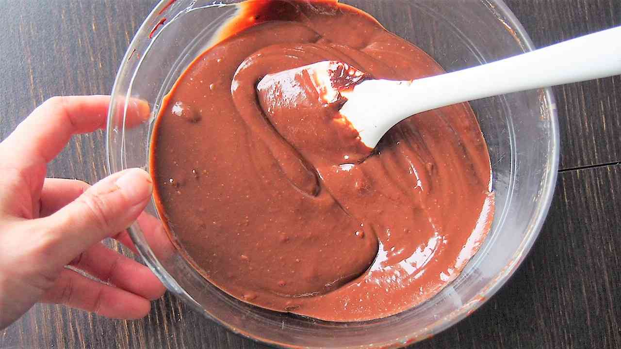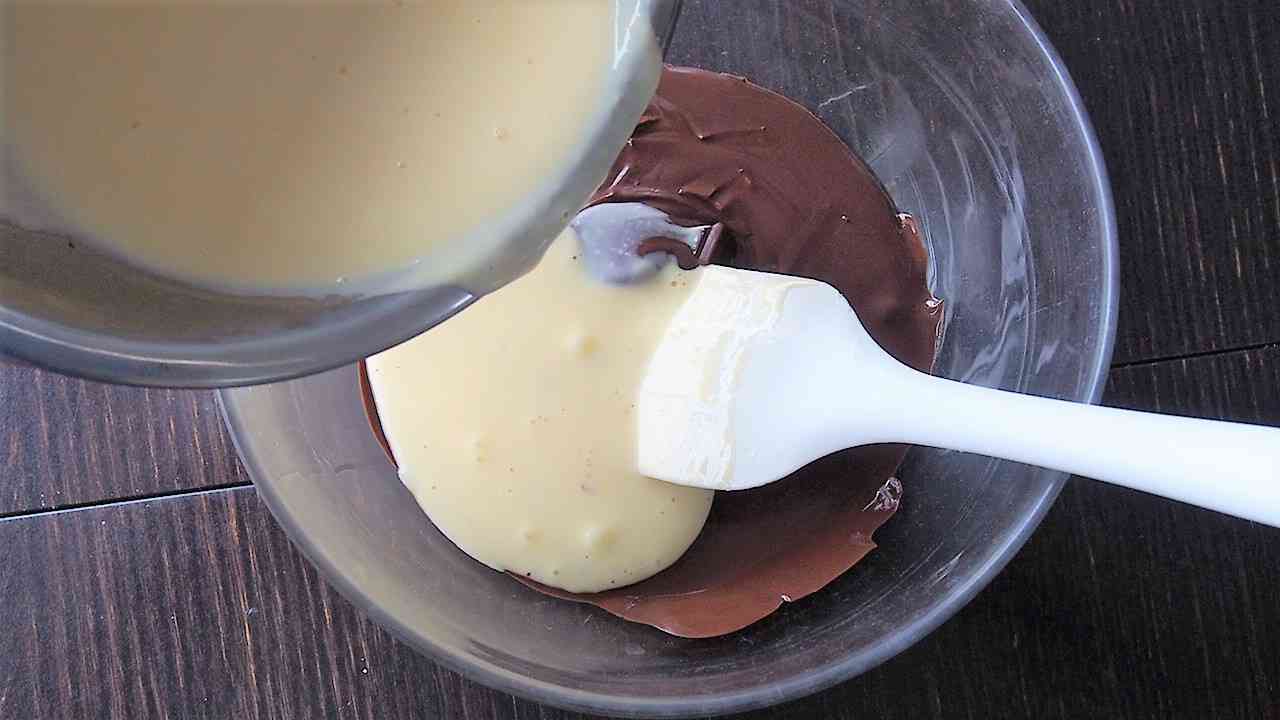 別のボールに漉し、3分の1ほどをチョコレートに入れゴムベラで混ぜる。