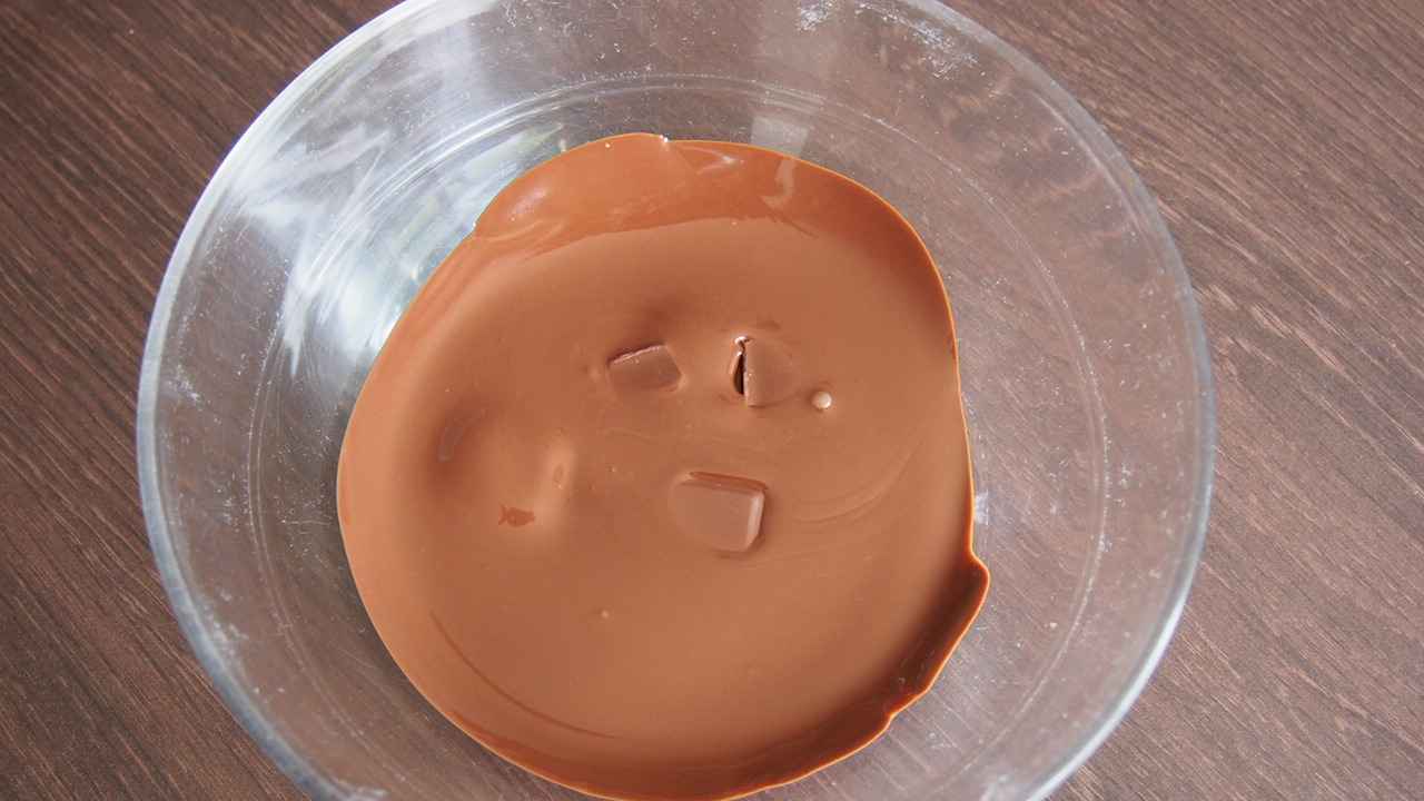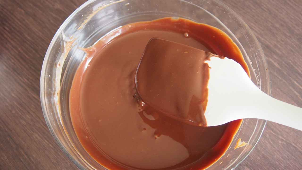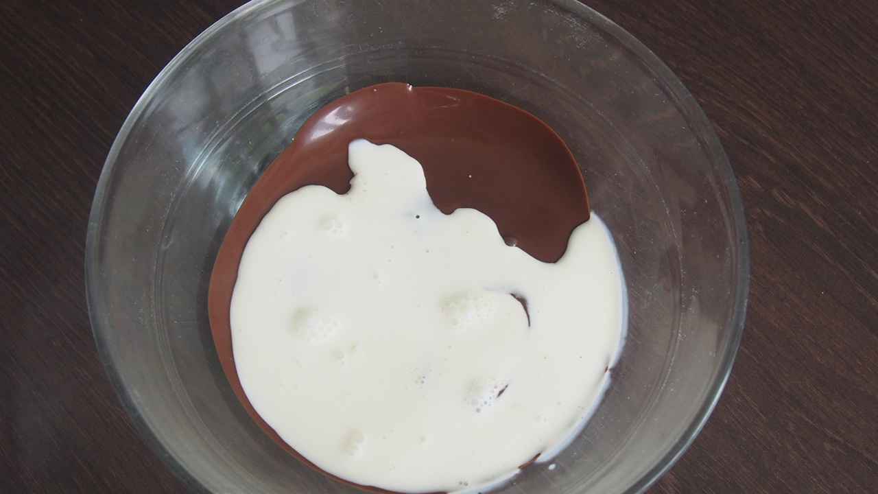生クリームを手鍋で温めて、少しづつチョコレートに入れ、その都度混ぜ合わせる。