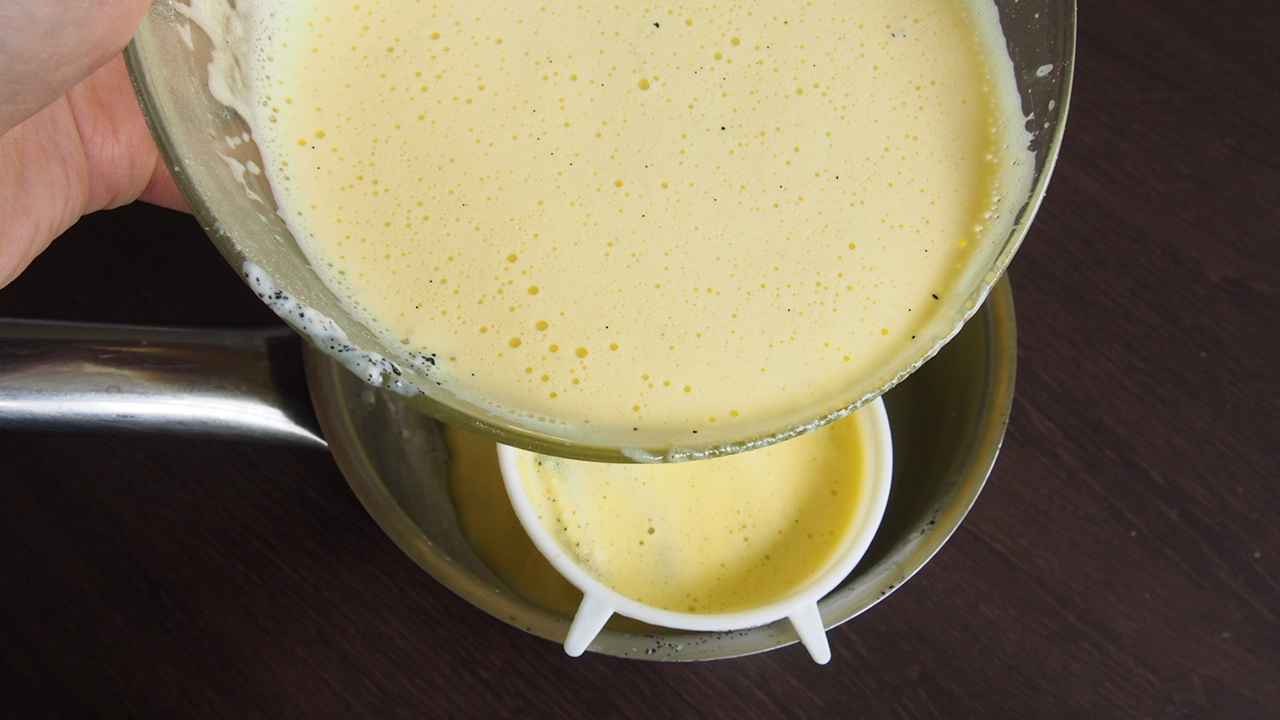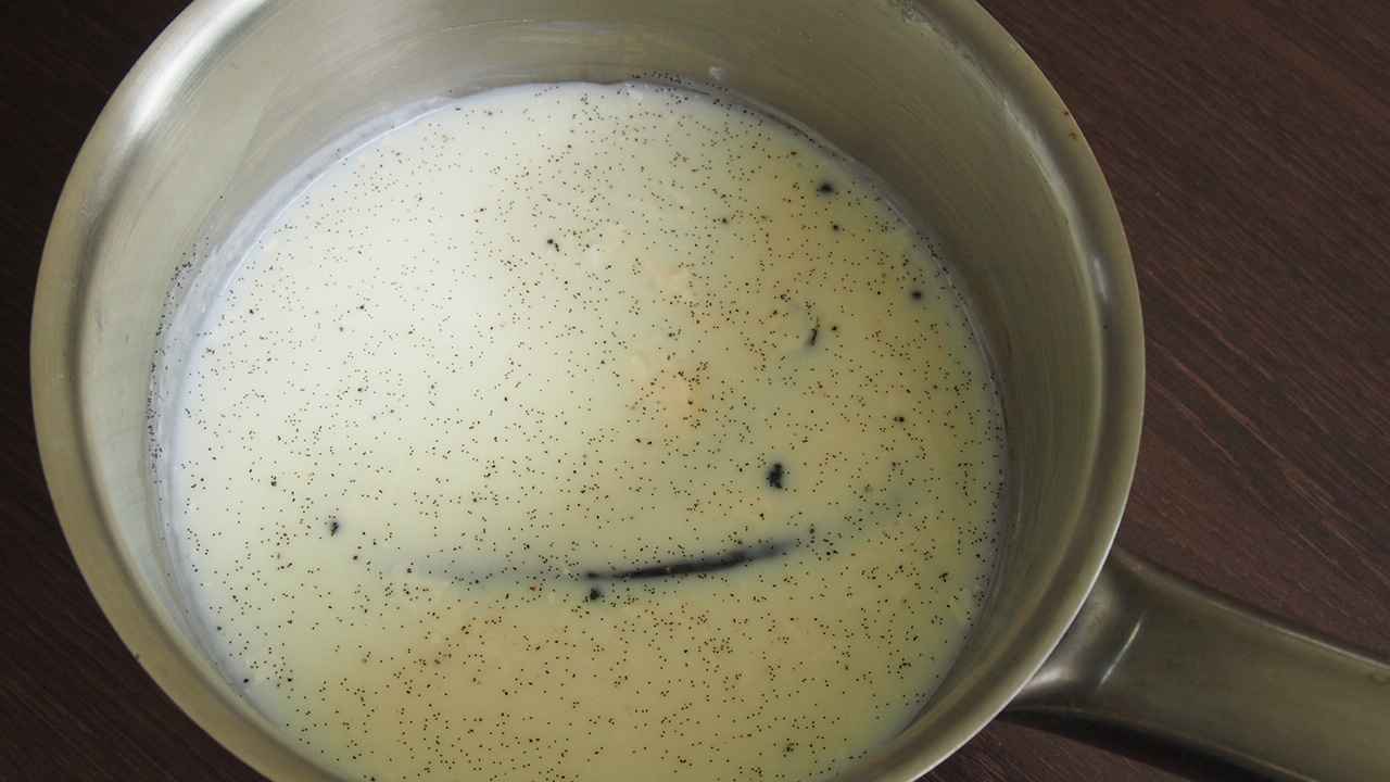 手鍋に牛乳とバニラの鞘を割いて種と鞘を入れる。