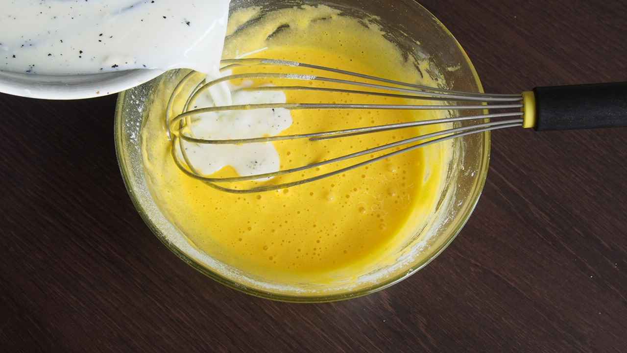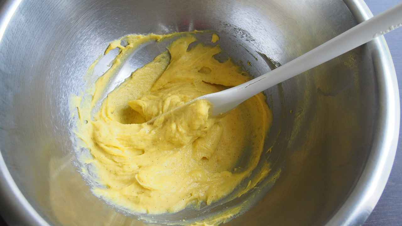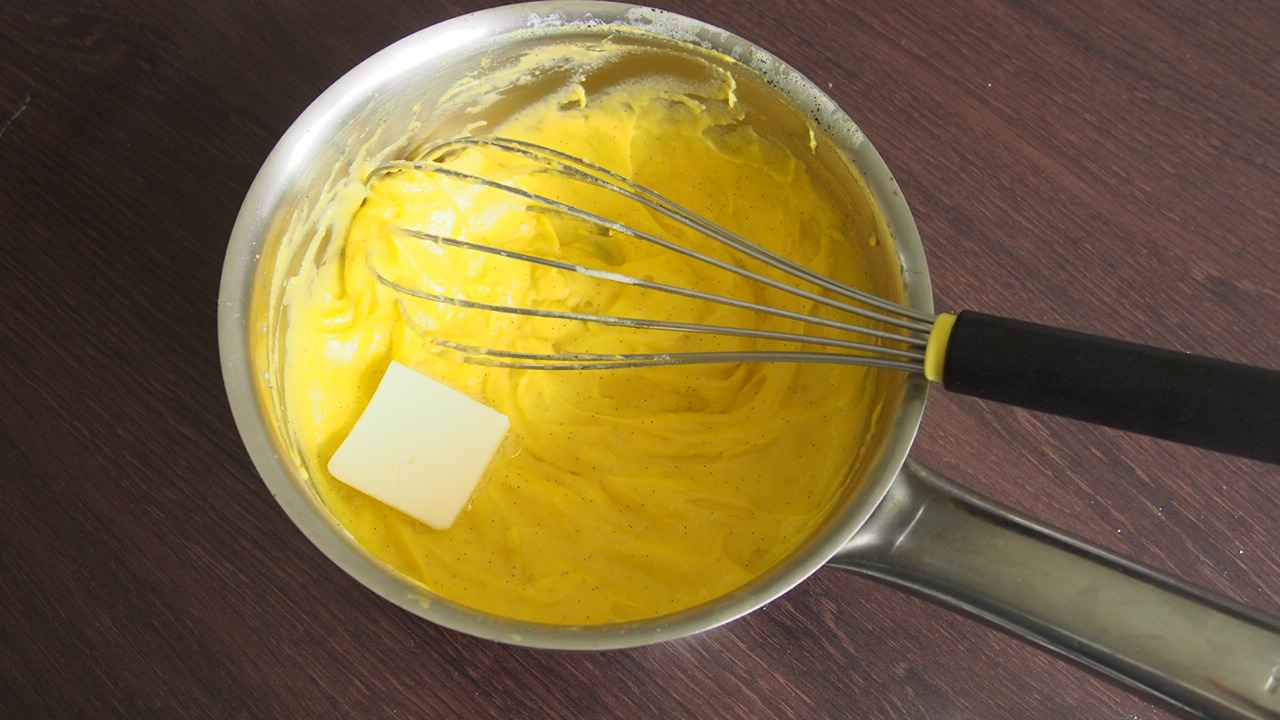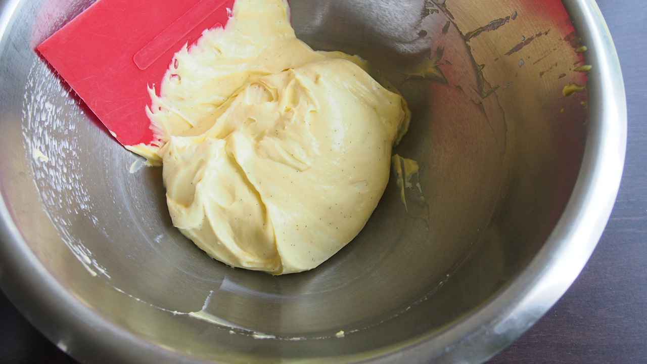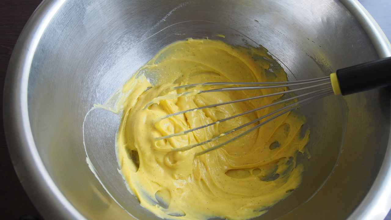 立てた生クリームの3分の1をカスタードに加え、しっかりと混ぜる。