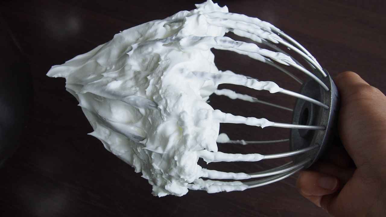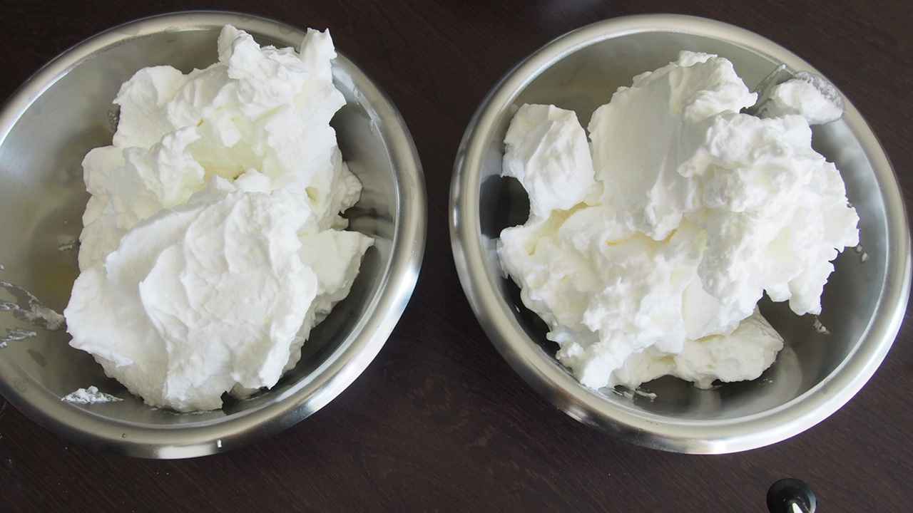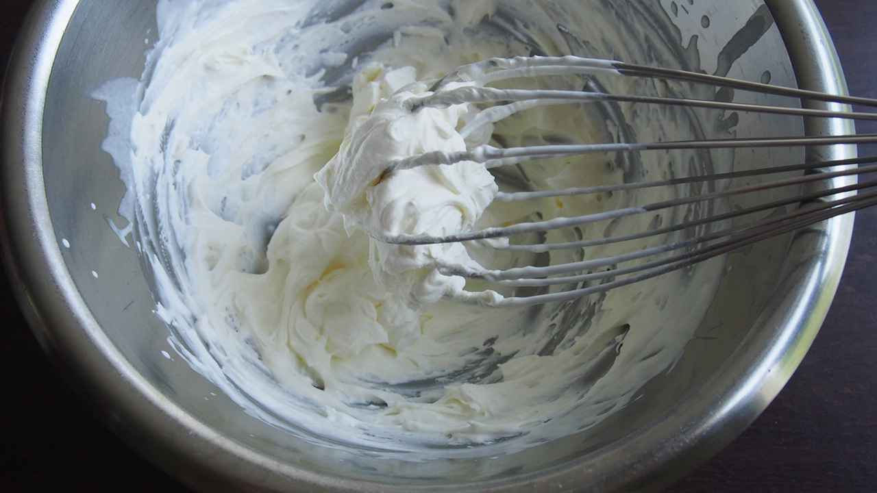 板ゼラチンを冷水で戻している間に、生クリームをしっかりと立てる。
