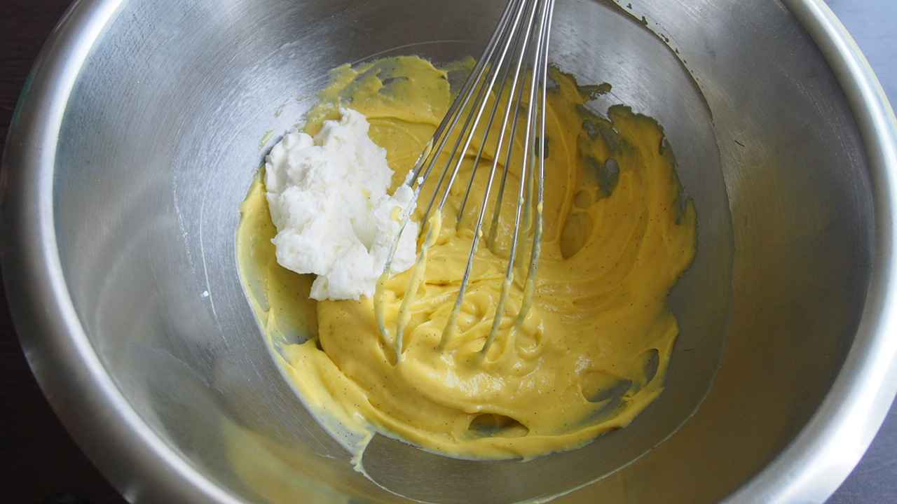 泡立てた卵白を3分の1加え泡立て器でしっかりと混ぜ合わせる。