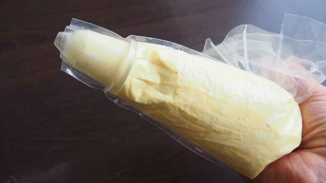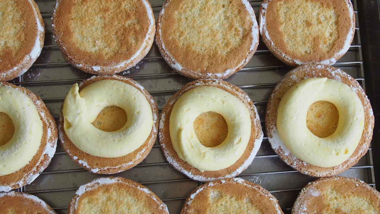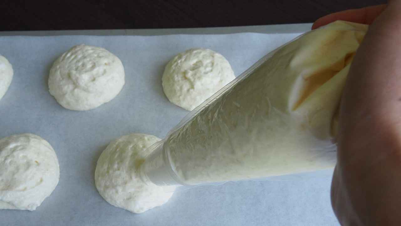 バニラクリームを絞り袋に入れてブッセに絞る。