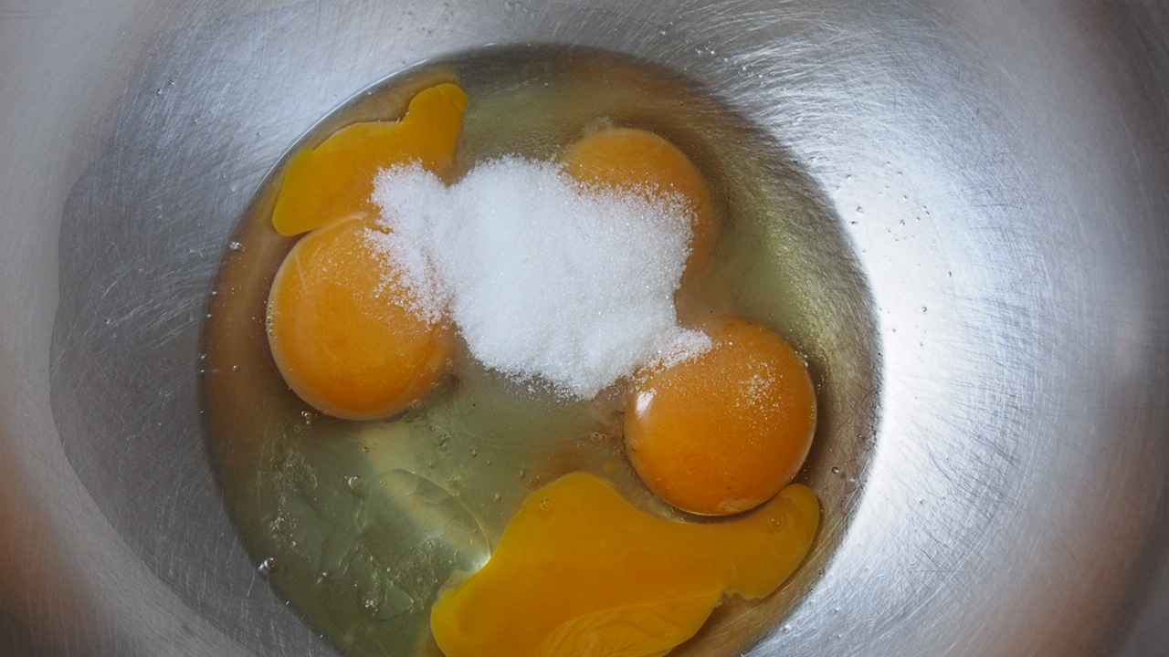 全卵、卵黄、水あめとグラニュー糖をミキサーでしっかり泡立てる。