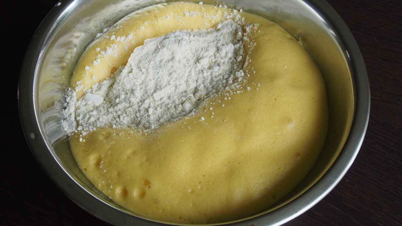 プレーン生地のふるった粉類とベーキングパウダーを加え混ぜる。
