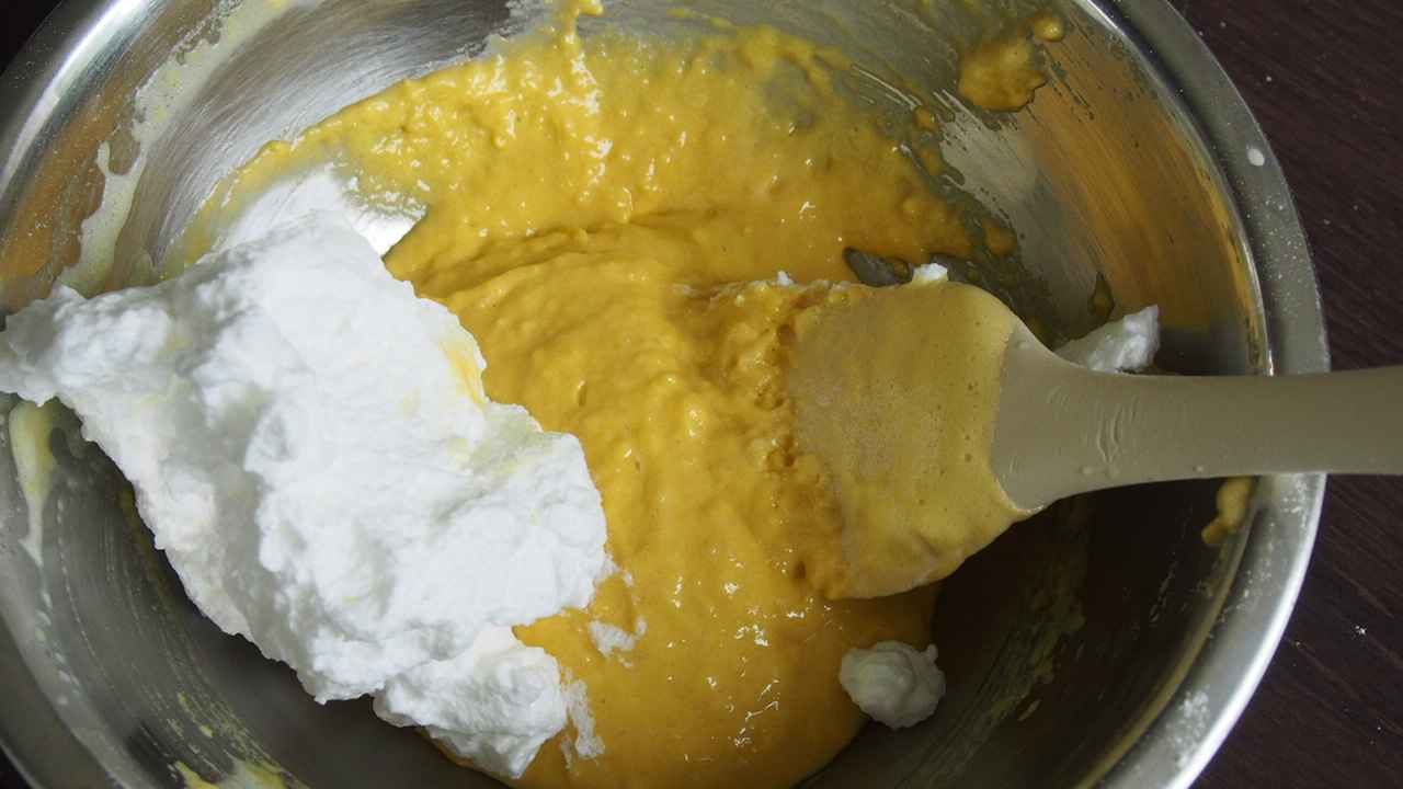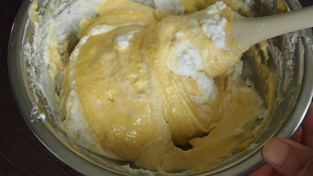 残りの卵白は2回に分けてゴムベラでさっくりと合わせる。
