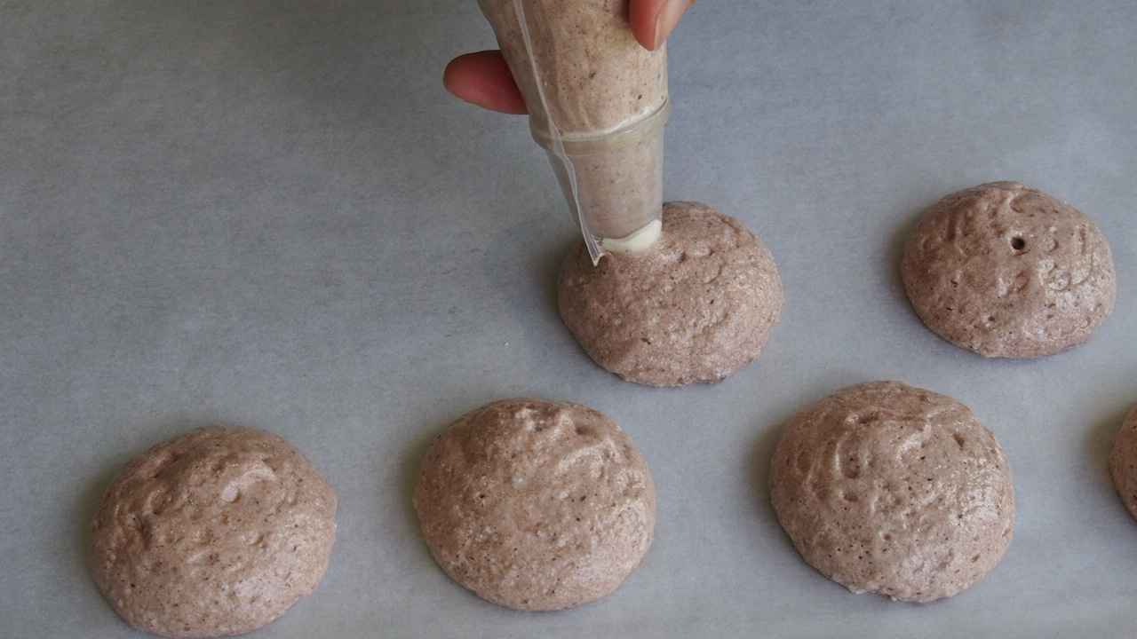 チョコレートガナッシュを絞り袋に入れてブッセに絞る。