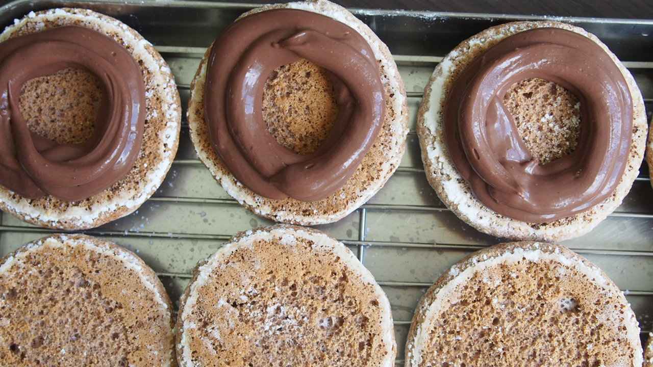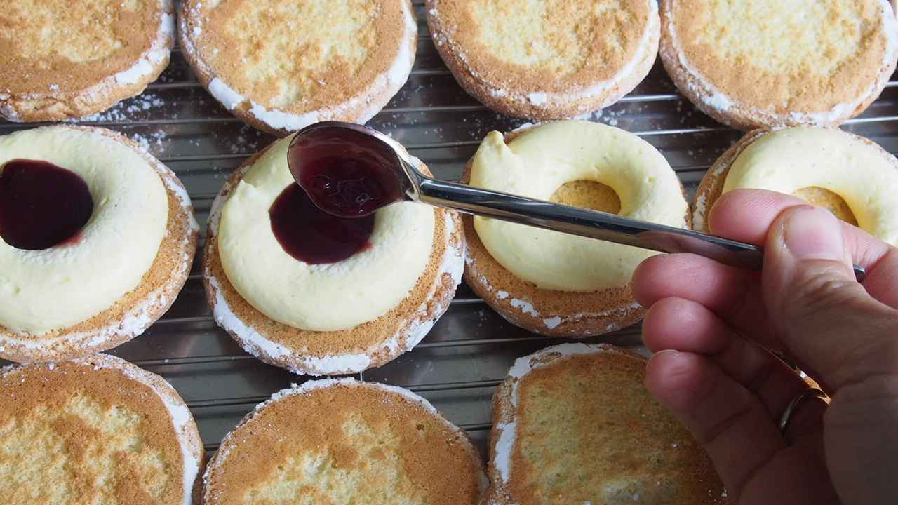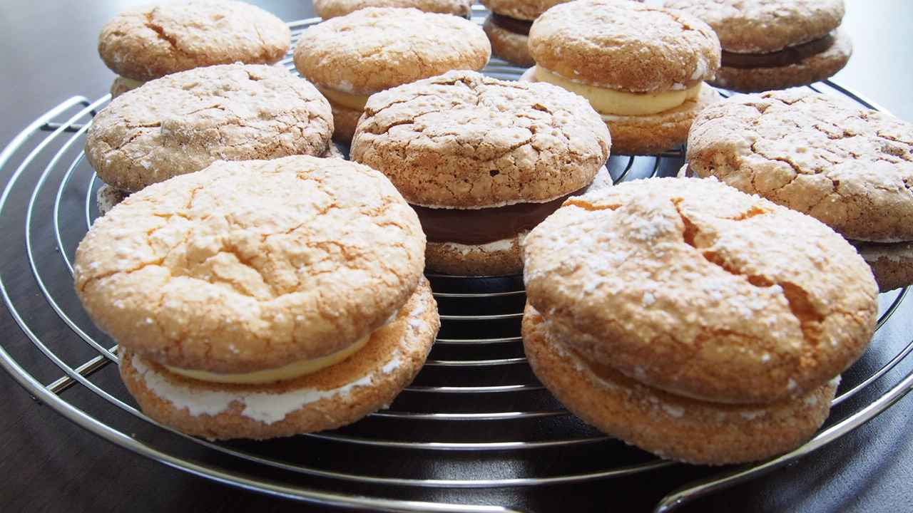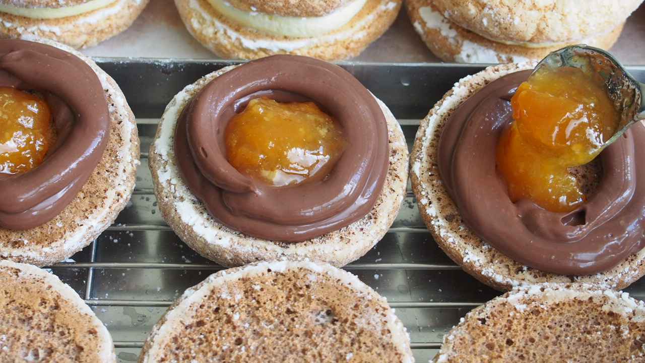 ふわふわとしていて歯切れのよい生地でサンドするのは、定番のチョコレートクリームですが、ほんのり苦みのあるマーマレードを加えることで飽きない味に。バニラクリームには酸味のあるフリュイルージュのジャムを加えました。