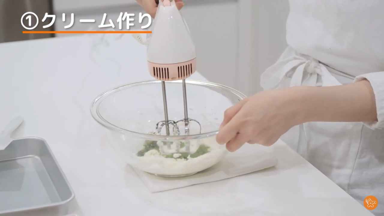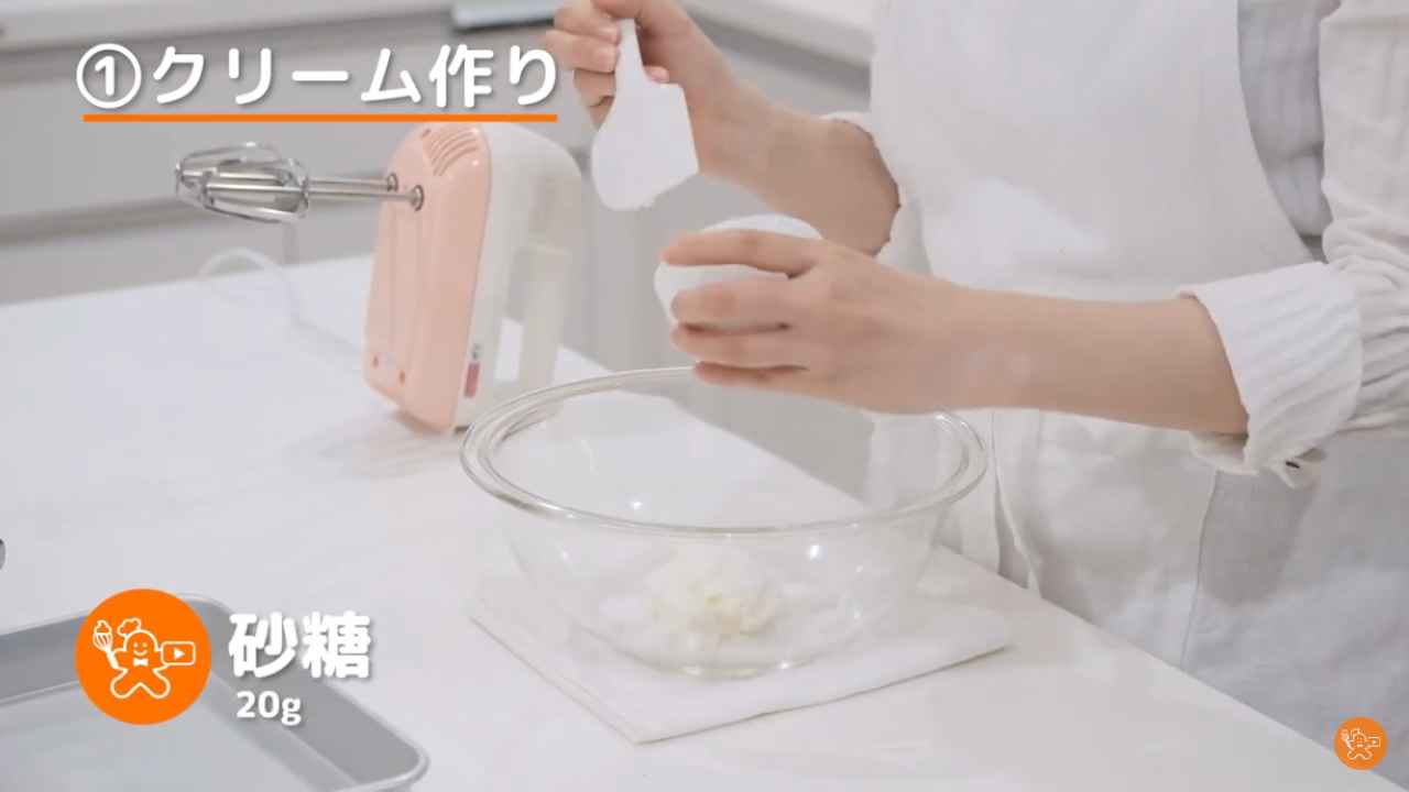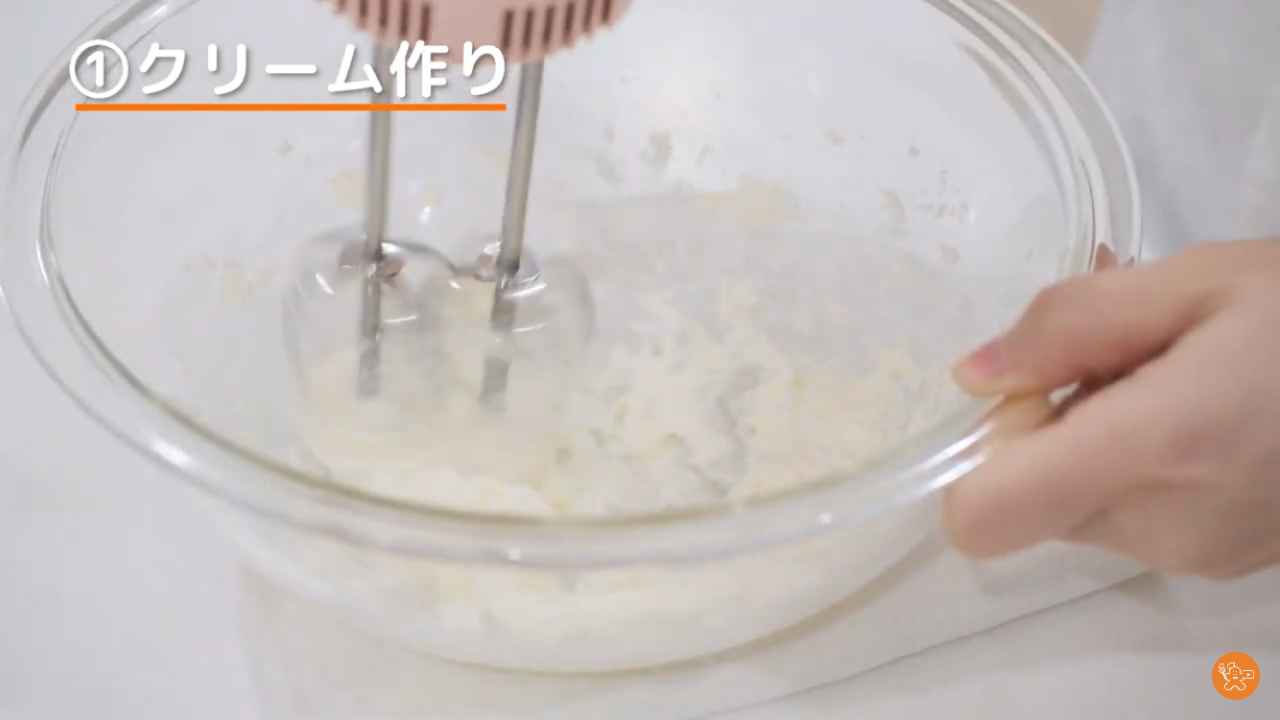 ボウルにクリームチーズと砂糖を入れて、ハンドミキサーで柔らかくする。