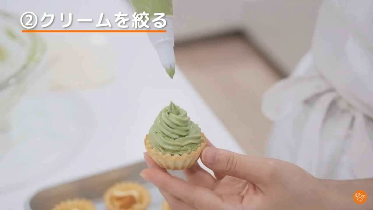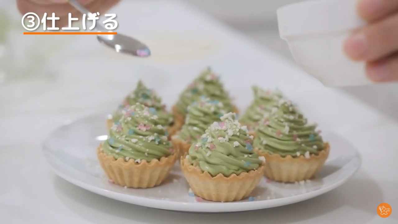 タルトカップに、ツリーのようにクリームを高く絞り、クランチやザラメなどをトッピングする。