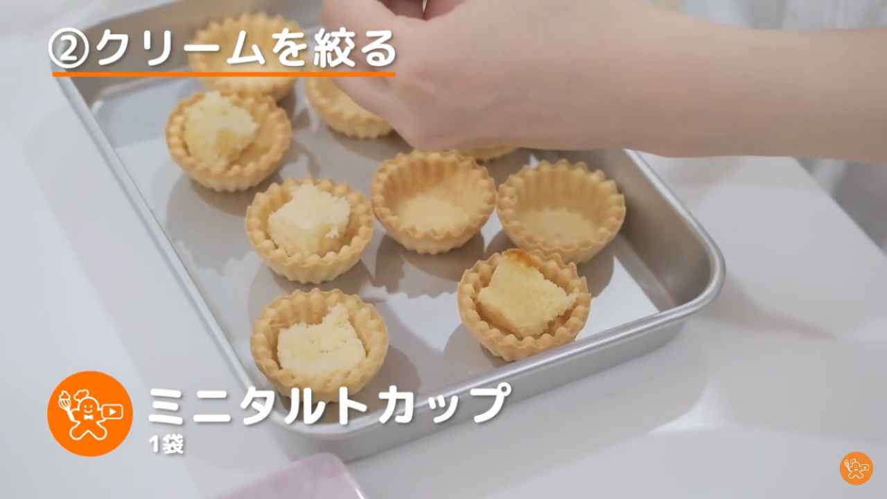 ミニタルトカップの中に、カステラを指でちぎって押し込むように入れる。