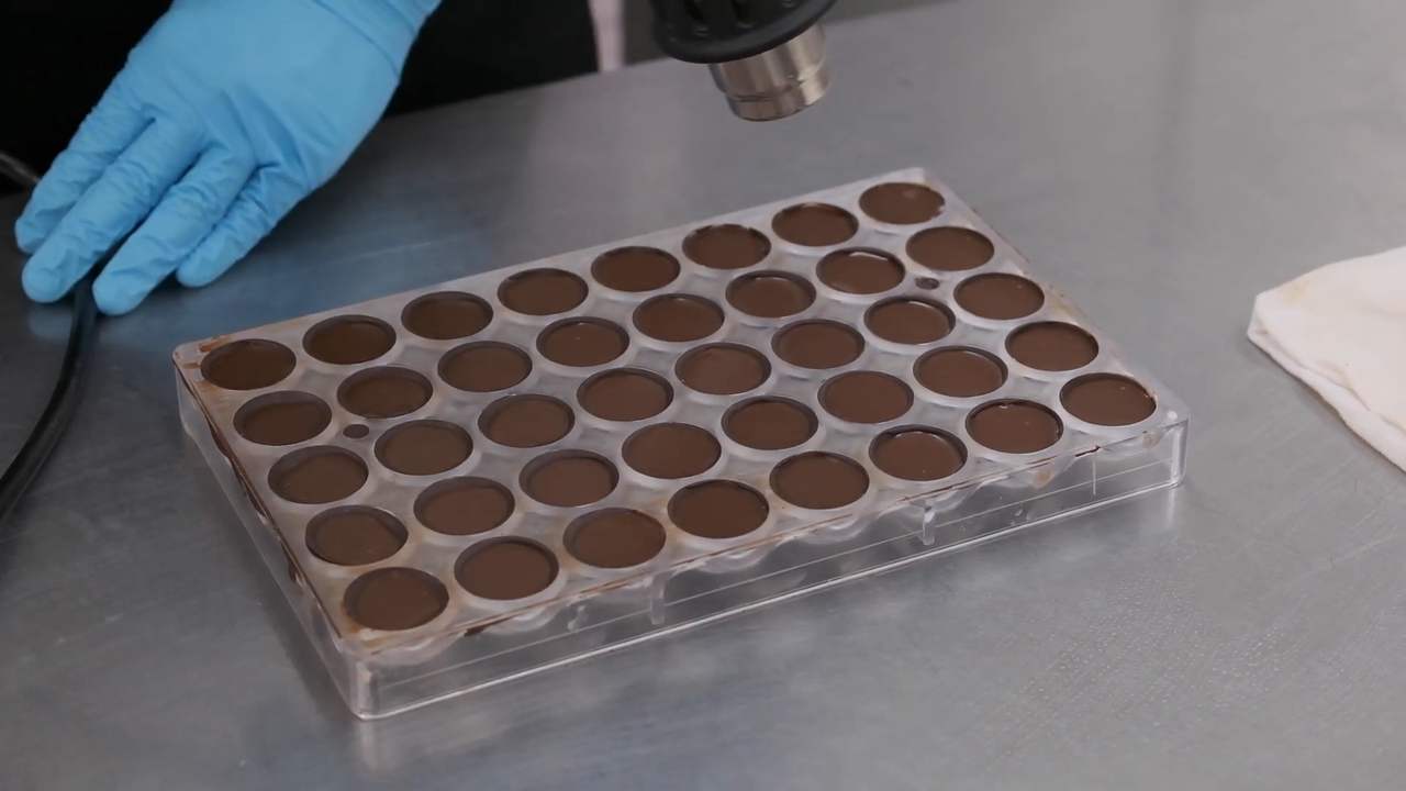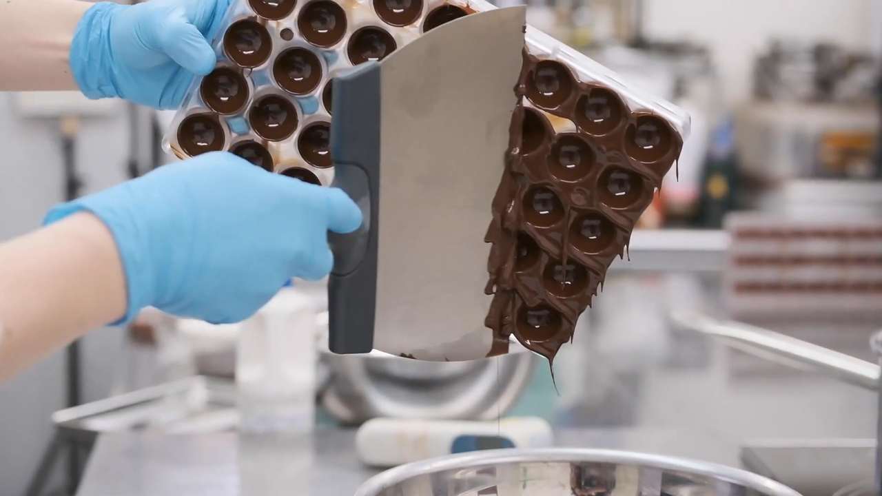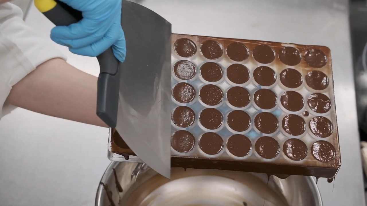 型を裏返して余分なチョコレートを落とし、表面をパレットでこそげ落とす。- 5