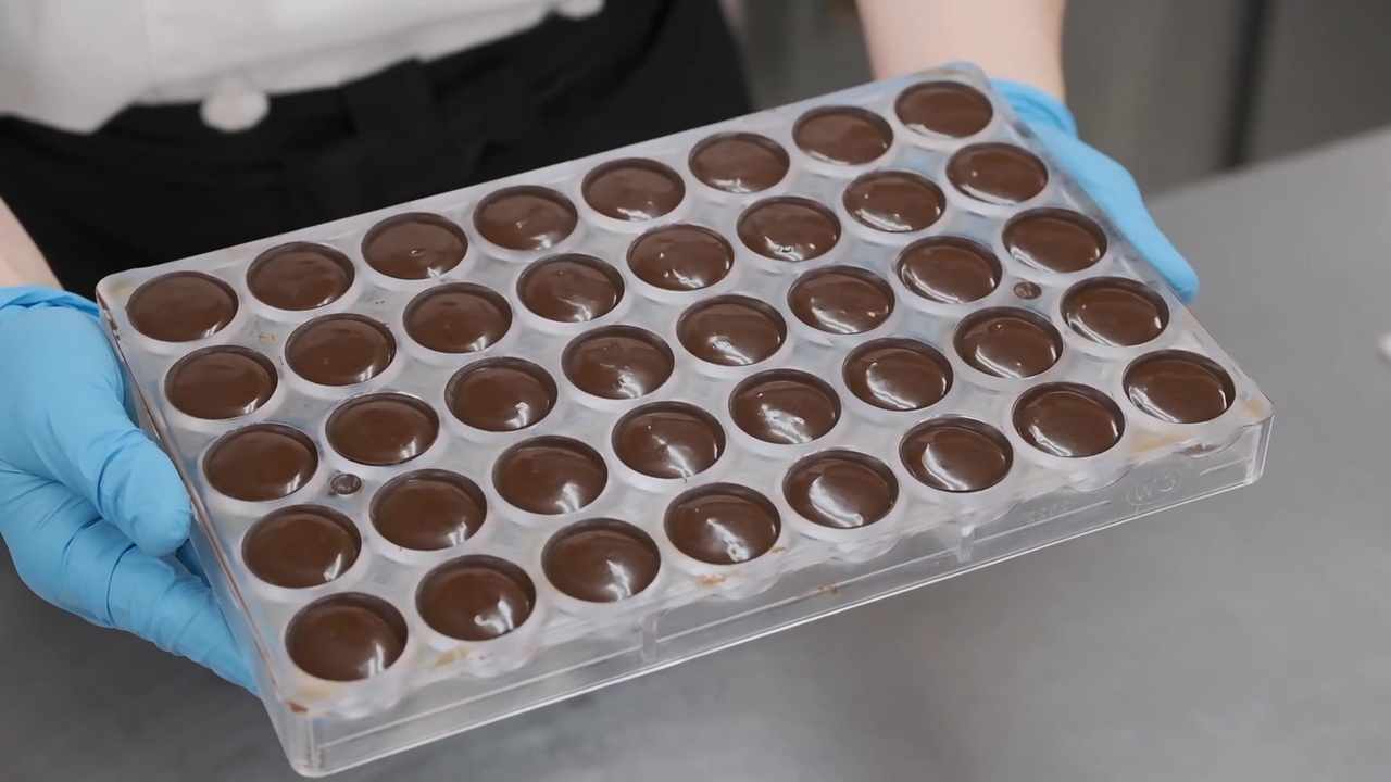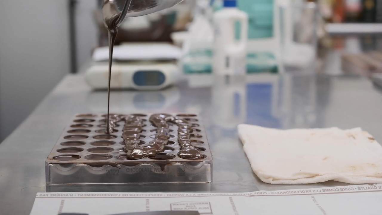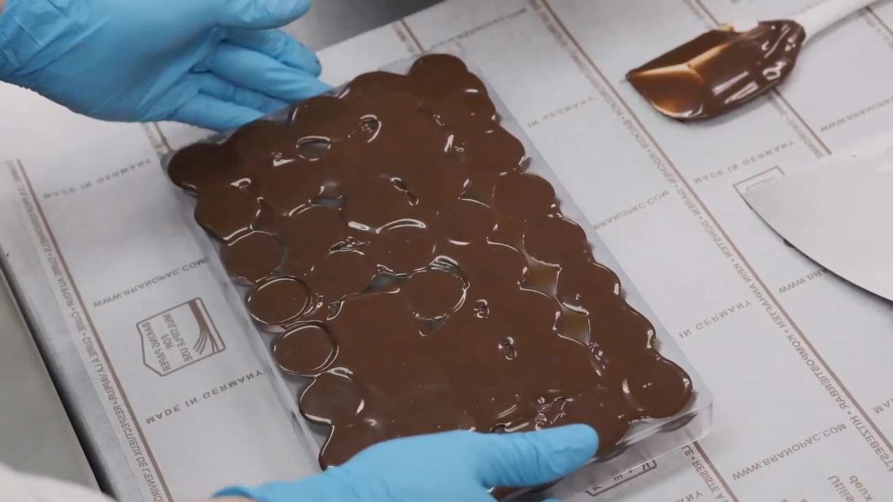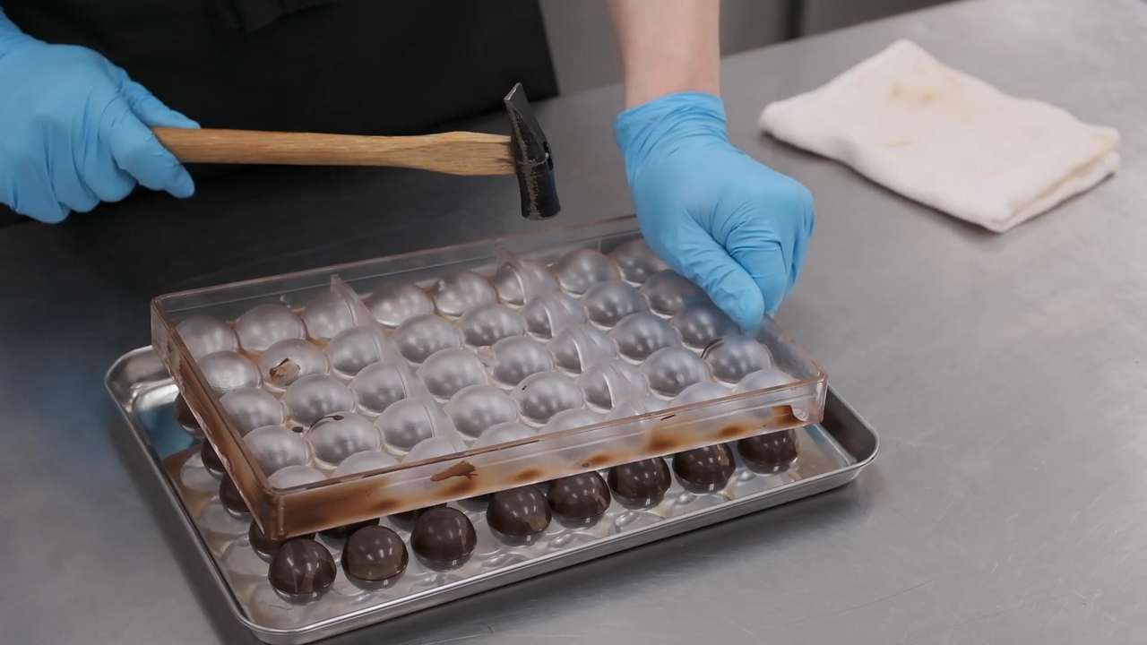 型を裏返して余分なチョコレートを落とし、表面をパレットでこそげ落とす。- 5
