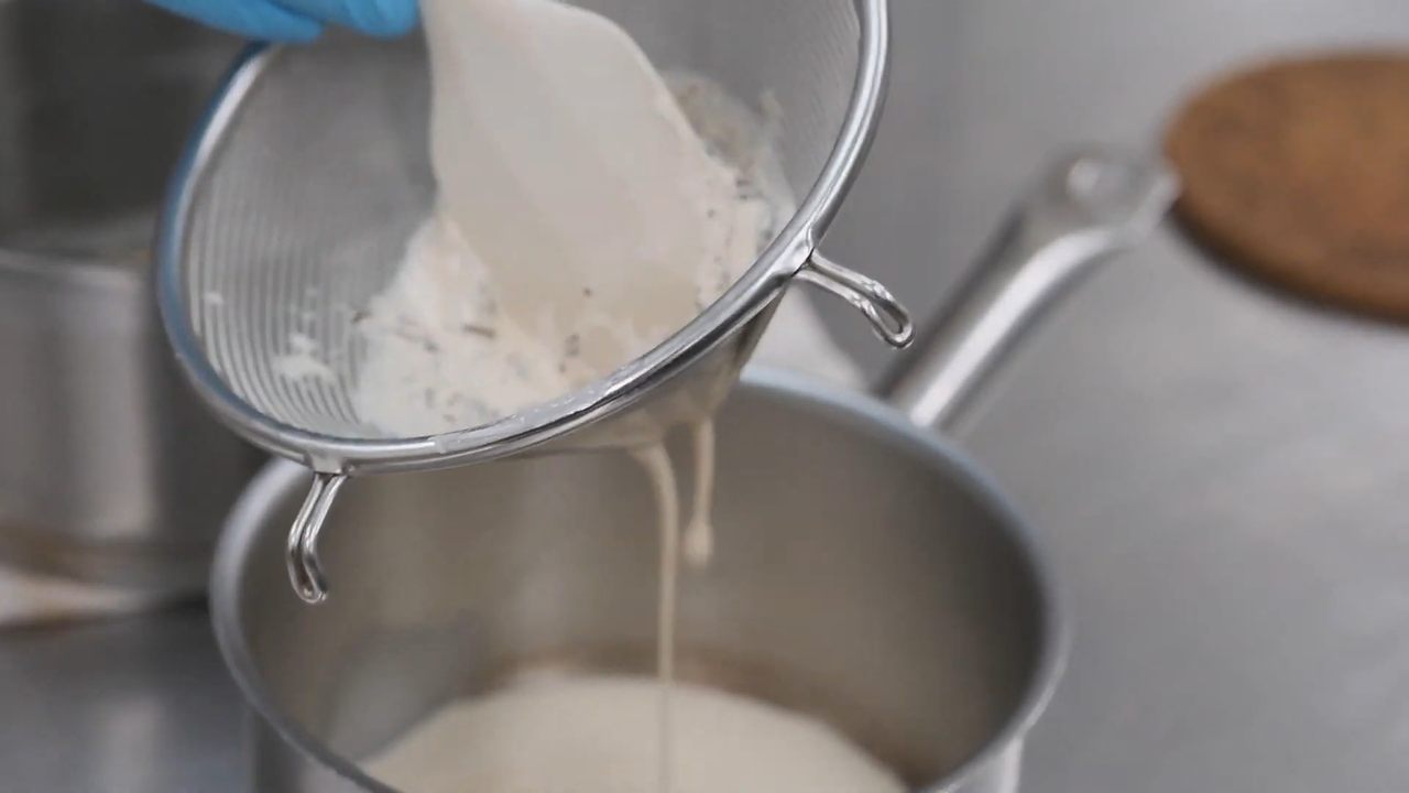 別の鍋にトリモリンを入れる。生クリームをザルで漉して鍋に注ぎ、加熱してトリモリンを溶かす。- 7