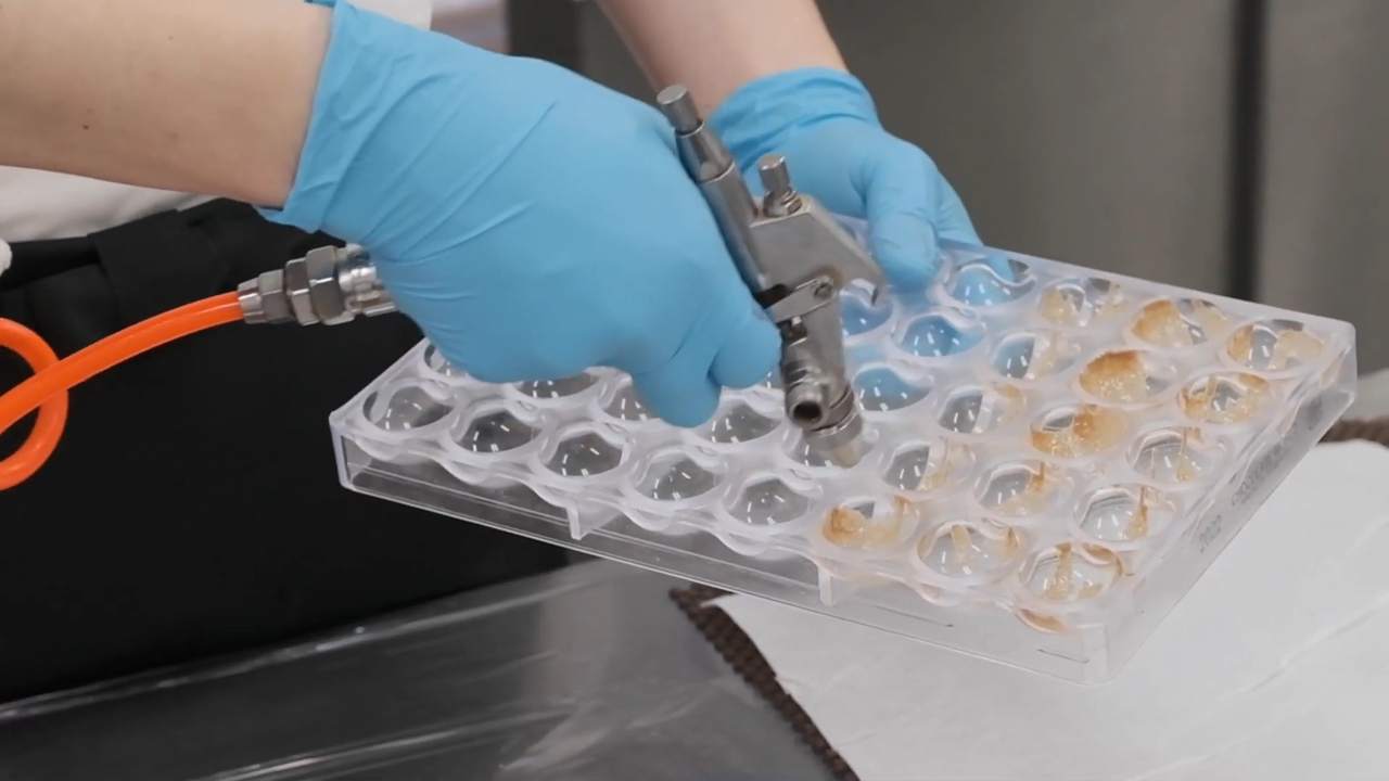 絞り袋に入れてモールディングした型に絞る。型をゆすって空気を抜く。- 11