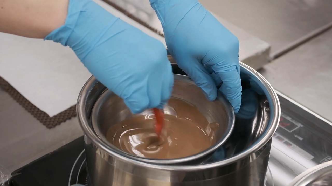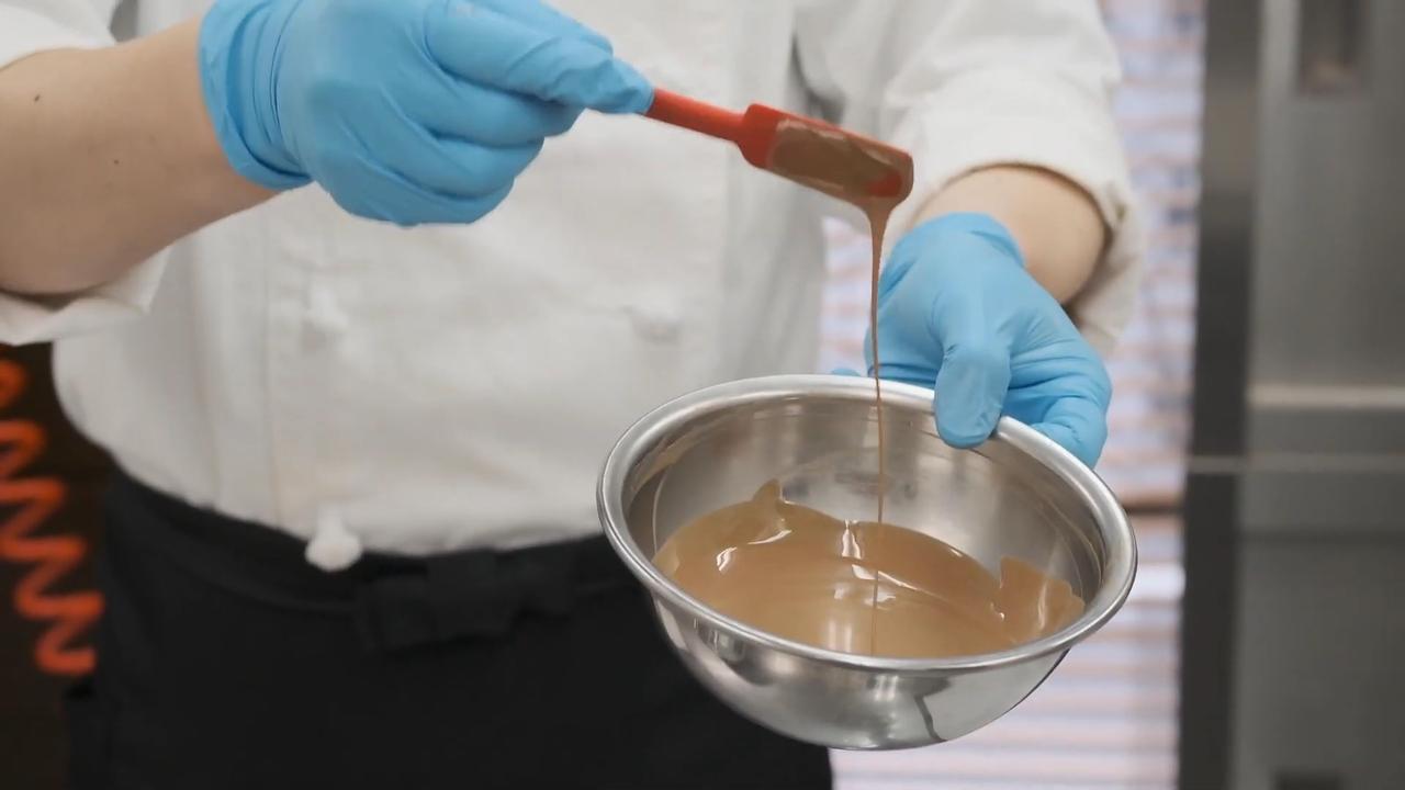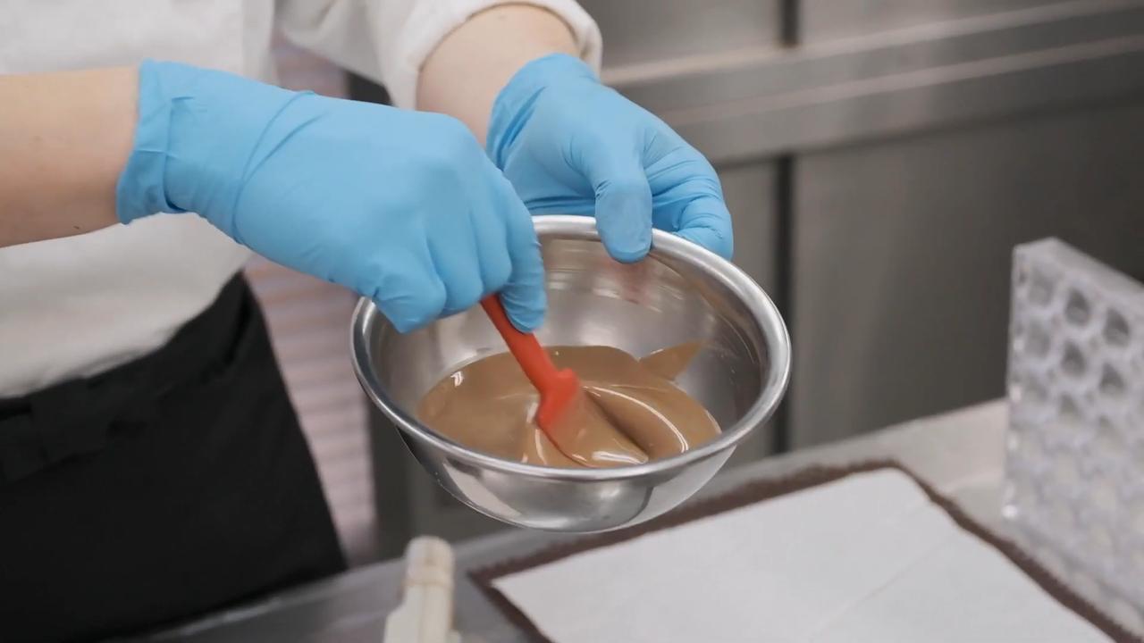 溶かしたクーベルチュールミルクチョコレートにカカオバターを20%追油する。- 2