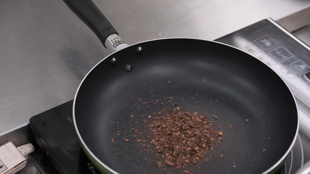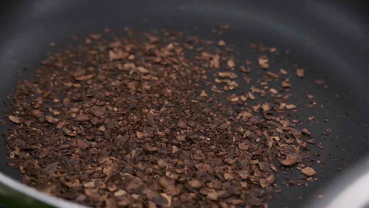 カカオハスクをフライパンに入れて、強火にかけて焦げないようにから炒りする。- 3