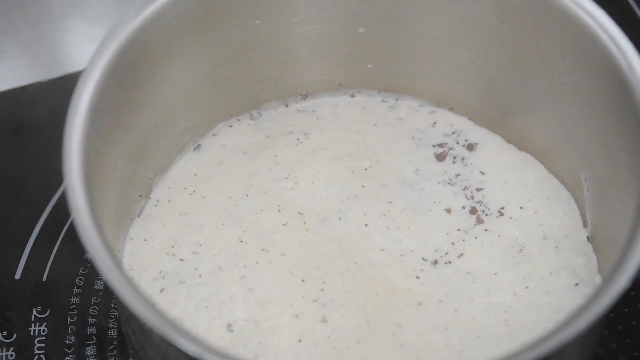 生クリームを3〜4回に分けて注ぎ、全体を乳化させる。