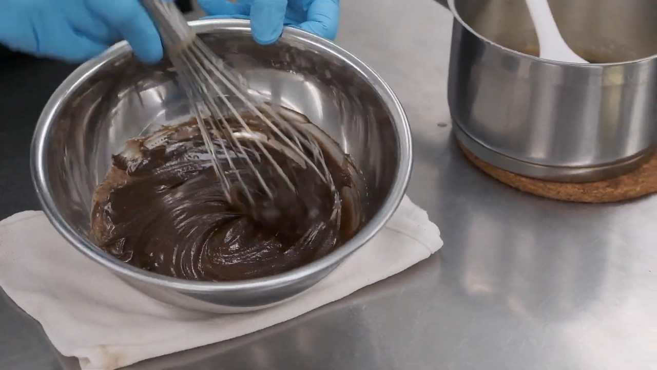チョコレートに少量注ぎ、ホイッパーで混ぜて水と油を分離させる。全体が固くざらざらとした状態になる。- 8