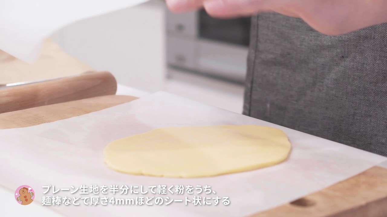 プレーン生地を半分にして軽く粉をうち、麺棒などで厚さ4mmほどのシート状にする- 2