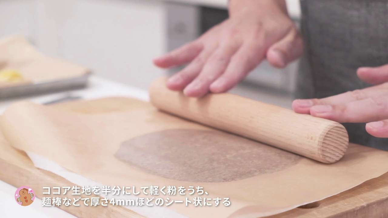 ココア生地を半分にして軽く粉をうち、麺棒などで厚さ4mmほどのシート状にする- 4