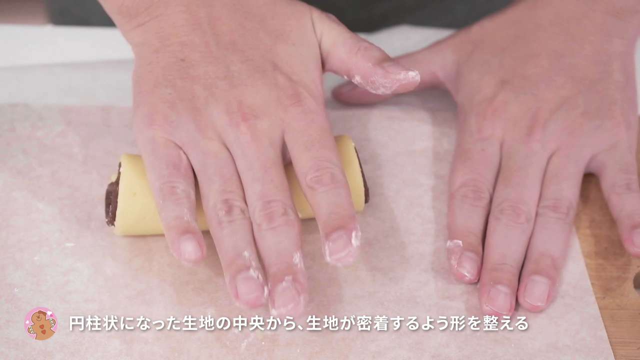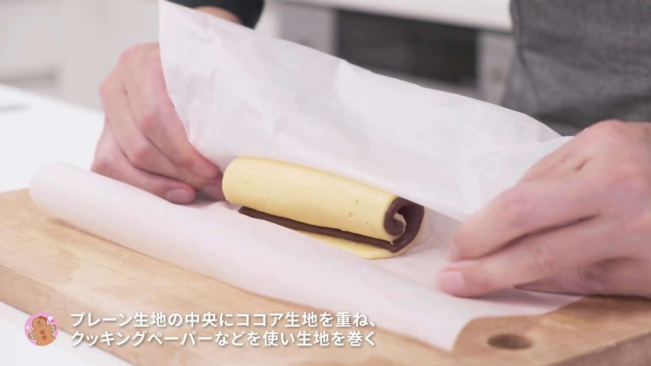 プレーン生地の中央にココア生地を重ね、クッキングペーパーなどを使い生地を巻く- 6