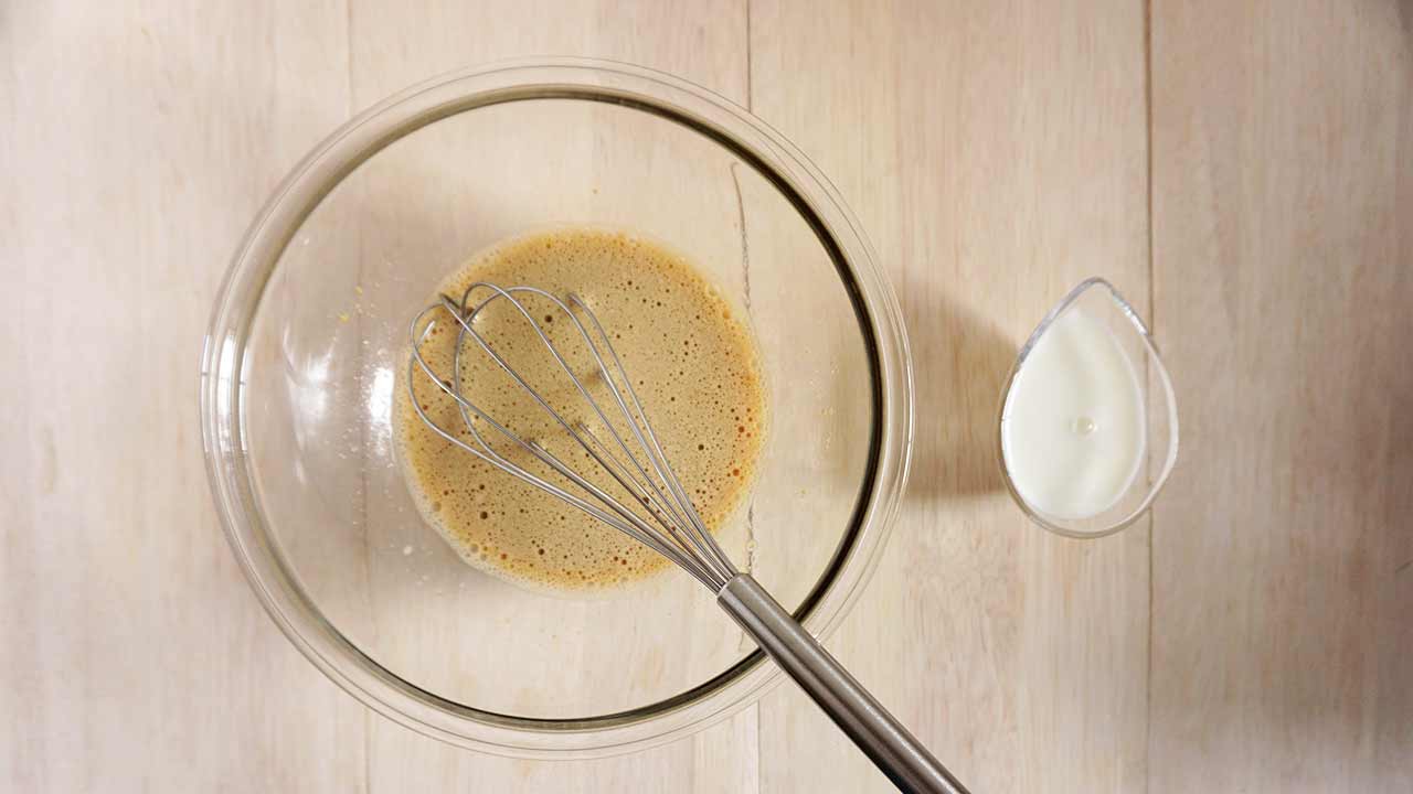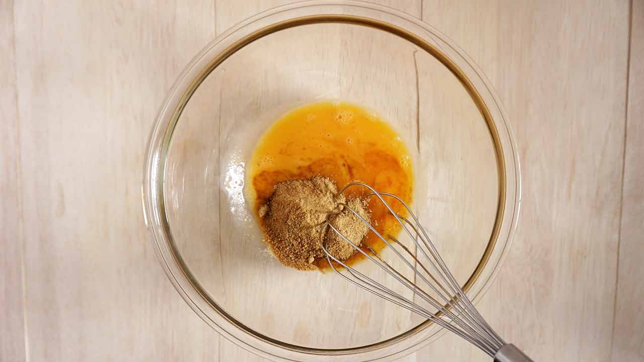 ボウルに卵とブラウンシュガーを入れ、すり混ぜます。