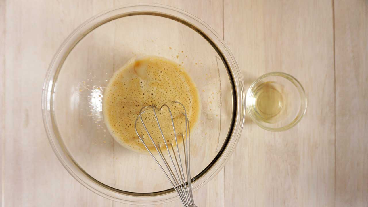 ①のボウルに太白ごま油を2〜3回に分け、加え混ぜます。