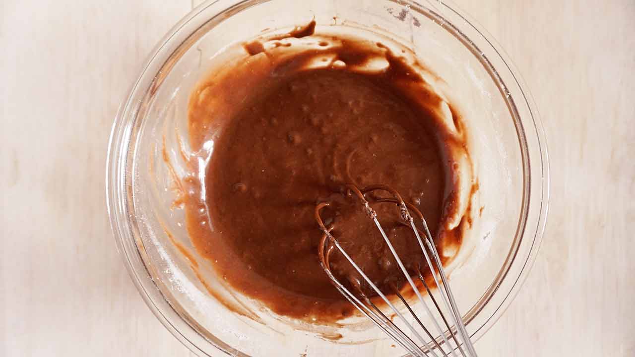 ふるいきったら、ボウルの中心からホイッパーでぐるぐる混ぜて、粉の壁を崩すように少しずつなじませていきます。