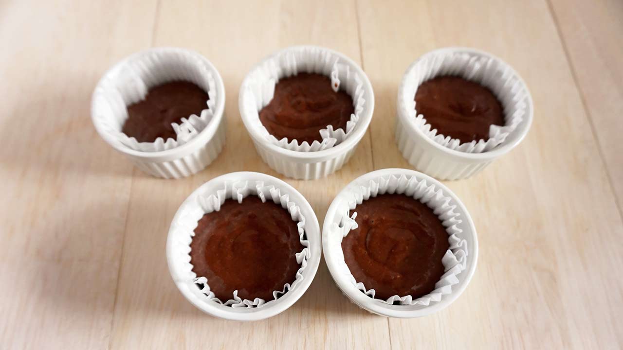 グラシン紙を敷いたココット型に、7分目まで生地を流します。