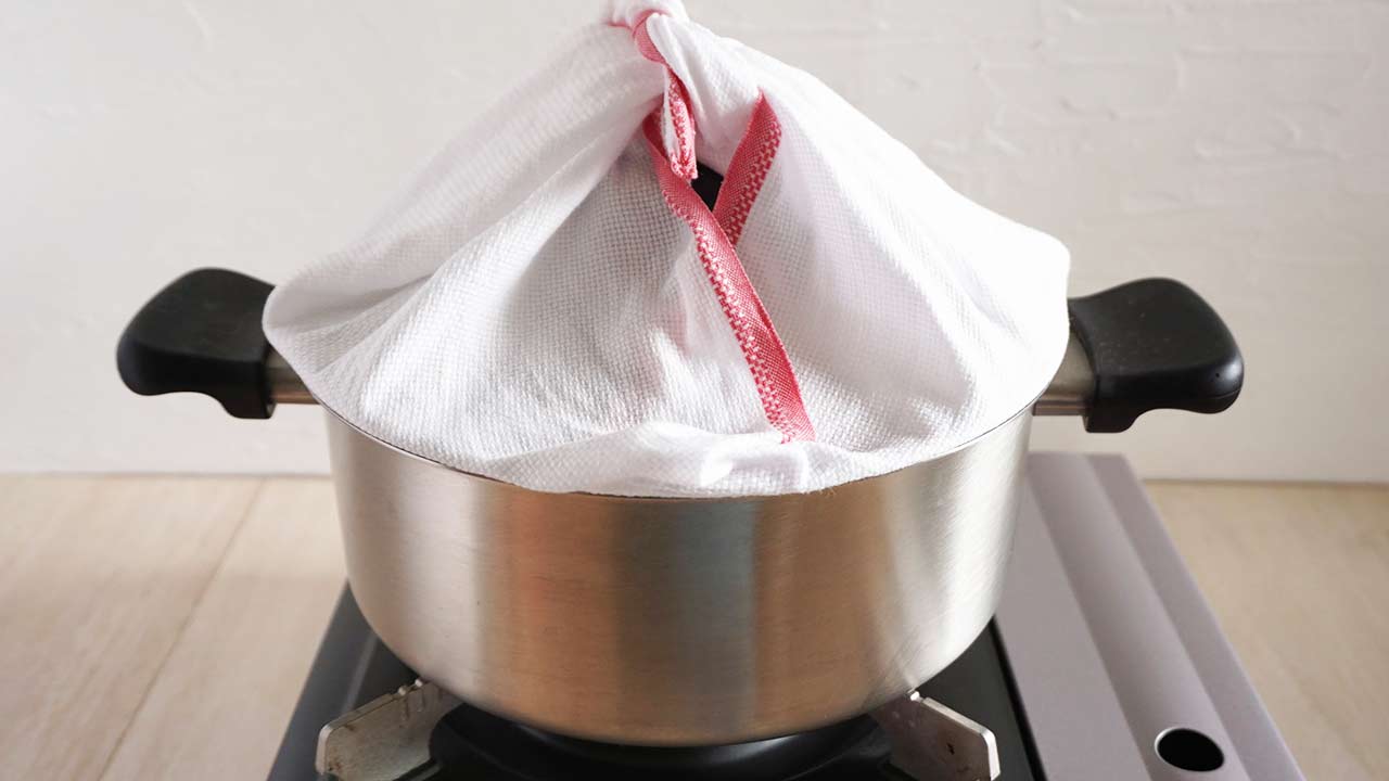 蓋には、水に濡らして硬く絞った大きめの布巾を巻き付けておきます。