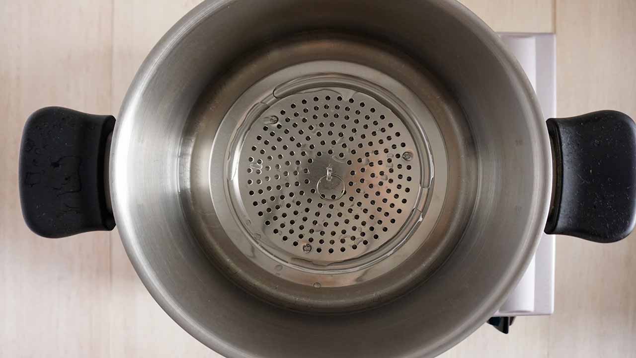 大きめの鍋に蒸し器をセットし、蒸し器ギリギリの高さまでお湯を注ぎます。