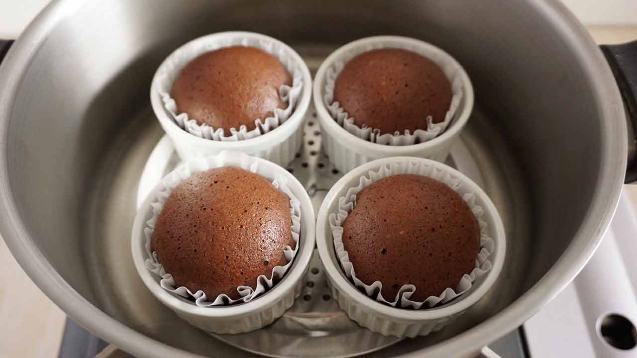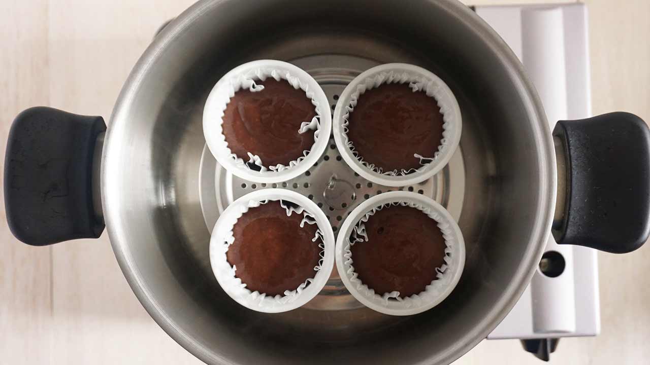 お湯が沸騰して蒸気が充満したら、蒸し器にココット型を乗せます。
