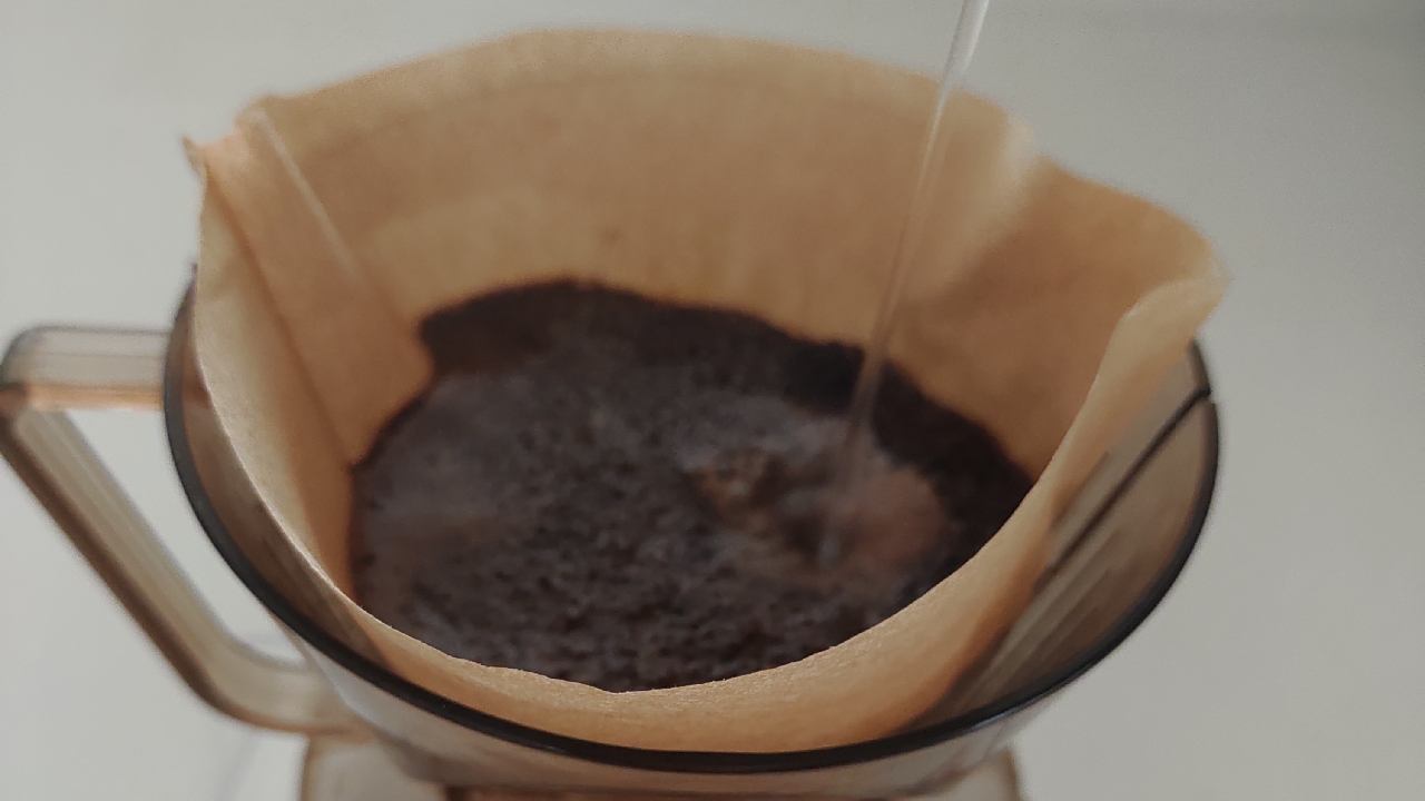 少し高めの位置から熱湯を少しずつ注ぎ入れ、適量で止めてドリッパーで一度蒸します。一回目の熱湯が抽出し終わったら、さらに熱湯を注ぎドリップしていきます。ドリッパーの状態により、繰り返し300c cの熱湯を注ぎドリップしています。