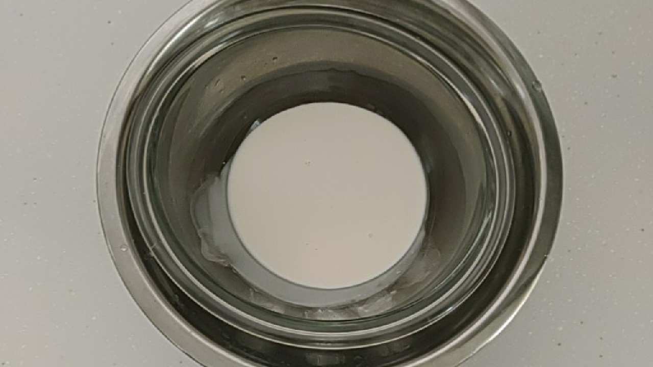 板ゼラチンが完全に溶けきってよく混ざったのを確認したら、粗熱をとりガラスカップに注ぎます。