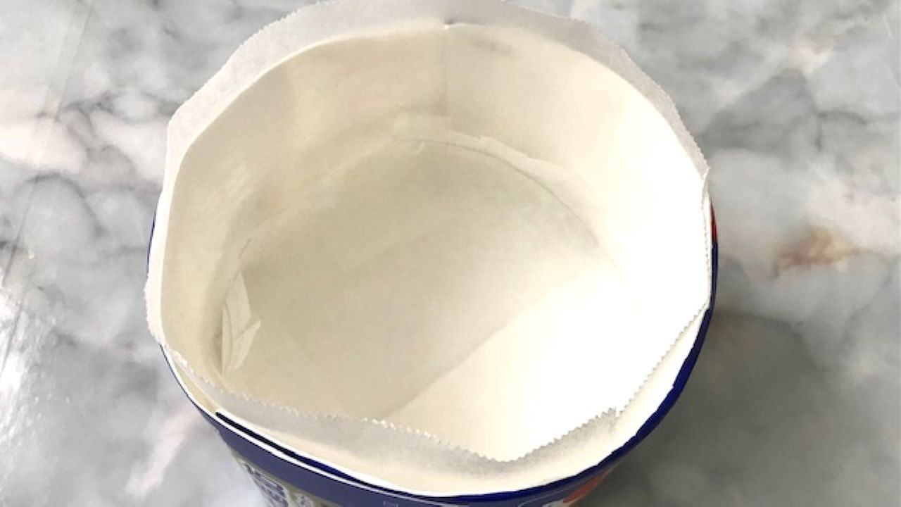 ※側面(枠)は、長さが足りないので牛乳パックの2面を使い、ホチキスでとめています。型が作れたらクッキングシートを敷きます。
