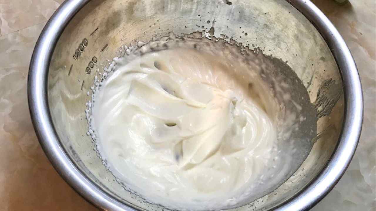 ボウルに生クリームを入れてツノが立つまでかたく泡立てます。