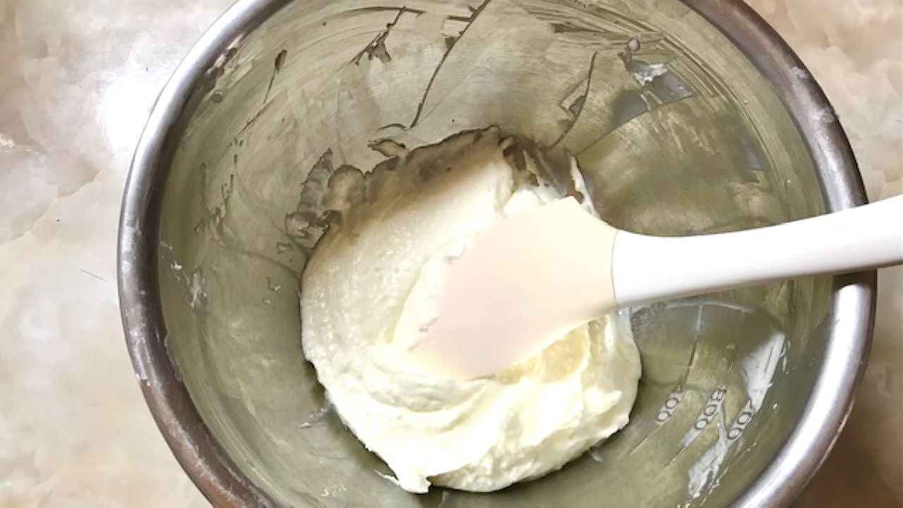 別のボウルにクリームチーズと砂糖を入れ、なめらかになるまでハンドミキサー(泡立て器)で丁寧に練り混ぜます。