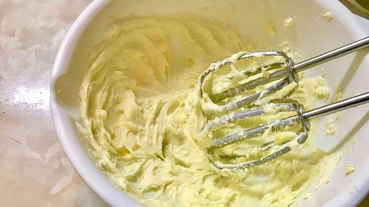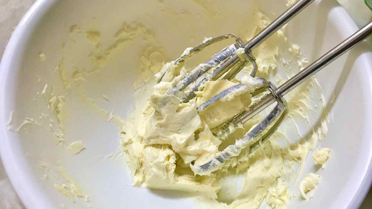 ボウルにクリームチーズとバターを入れて、ハンドミキサーでなめらかになるまで混ぜ合わせます。