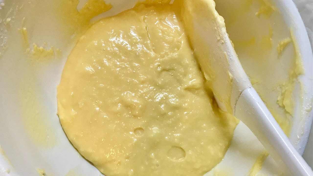 ○粉を入れてからの生地の混ぜ合わせは、とても重要な工程です。練ってしまうと粘りの原因となるグルテンが発生し、目の詰まったかたい生地になってしまいます。また、混ぜが足りないと膨らみや食感が悪くなるので注意してください。生地に少しツヤが出るまで縦に切るように混ぜるのがコツです。