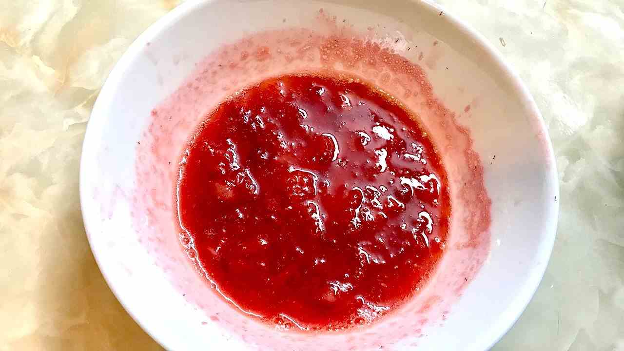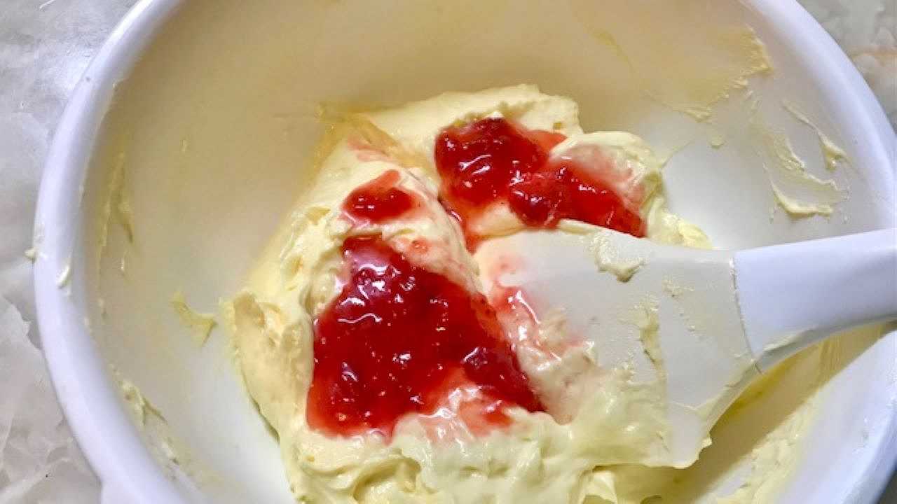 4にいちごジャムを約2/3加えて、3~4回大きく切るように軽く混ぜ合わせます。※完全に混ぜないようにします。