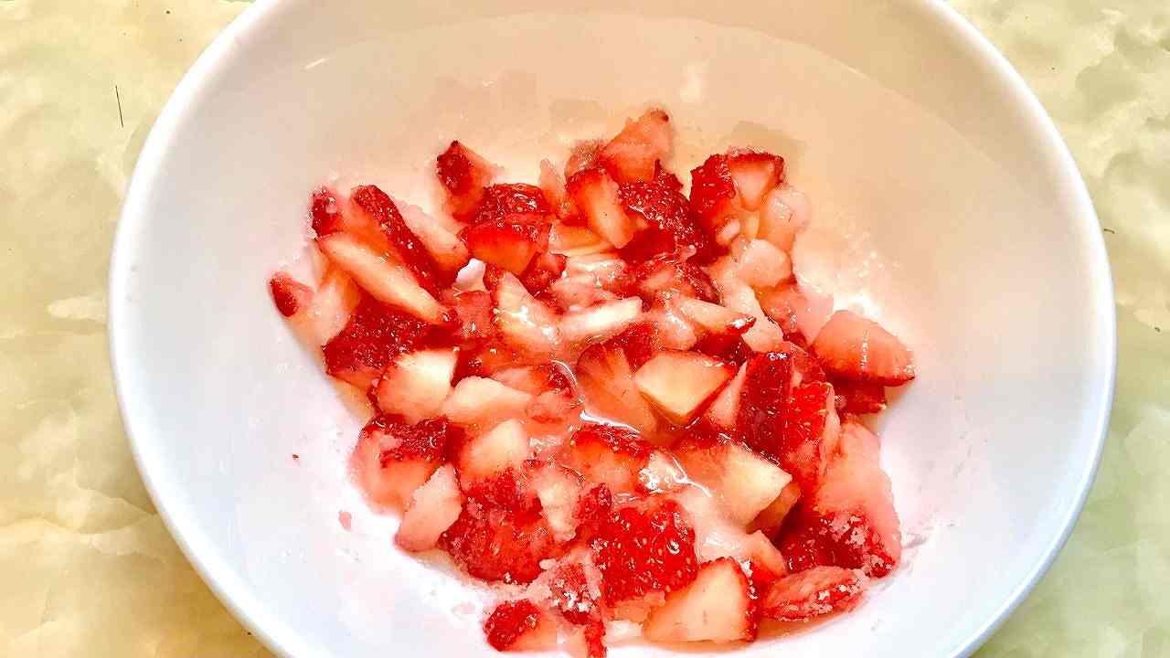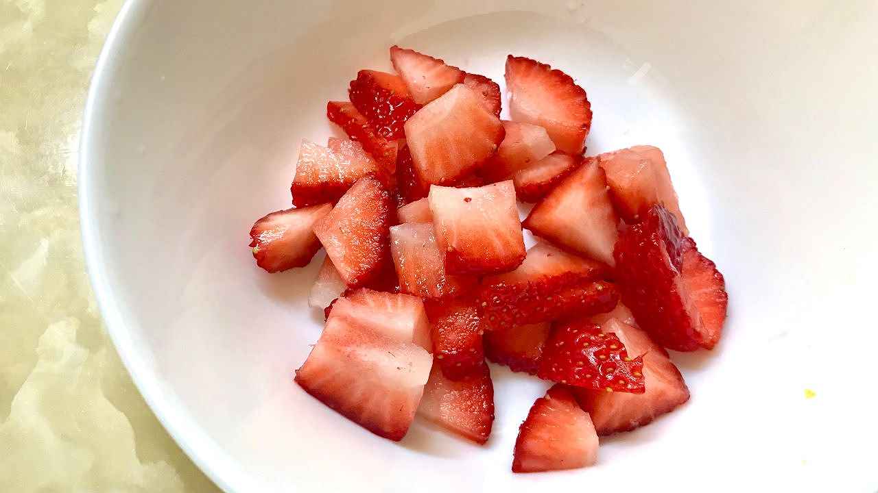 いちごは洗ったら1.5cm程の角切りにカットします。