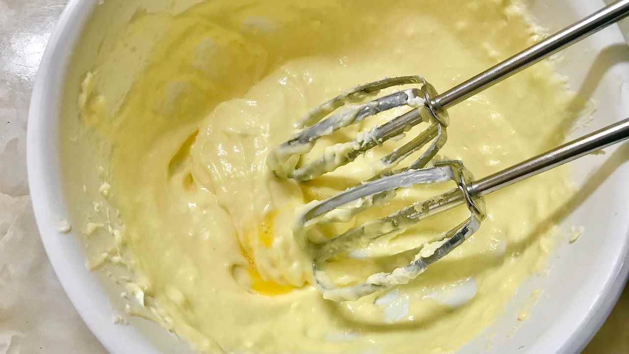 1に砂糖を加え、ふんわりするまでハンドミキサーで良く混ぜ合わせます。