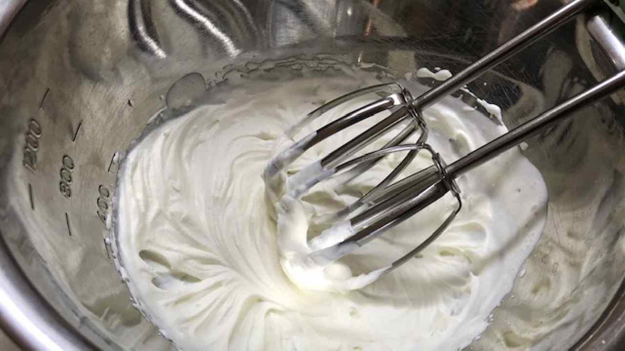 ボールに生クリームと砂糖を入れてツノが立つまで泡立てます。