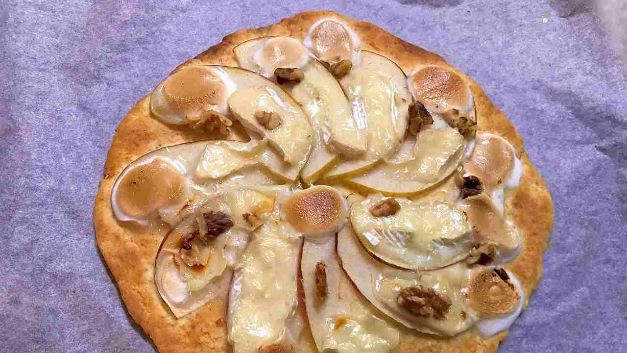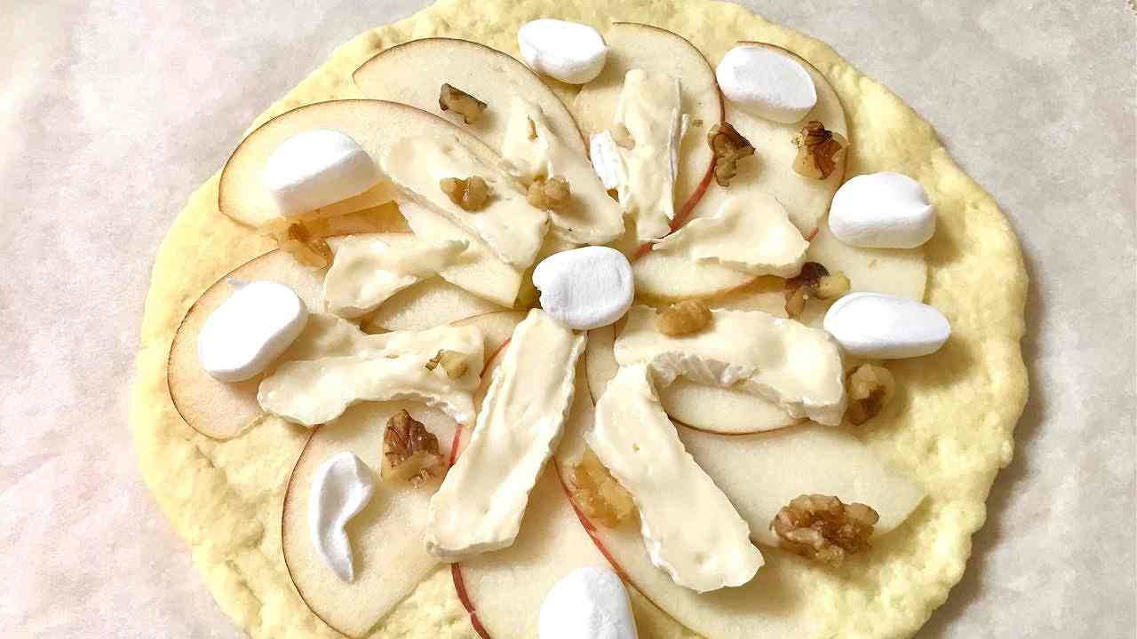 カリっ、ふわっとしたピザ生地の上に、りんご、くるみ、カマンベールチーズ、マシュマロをのせて焼き上げました♪
