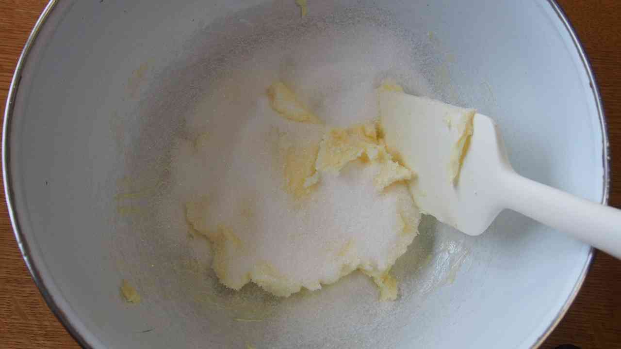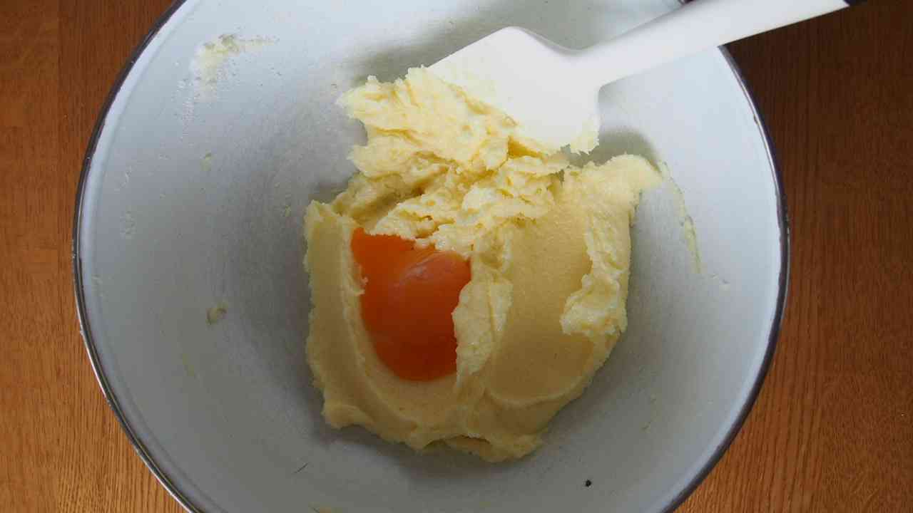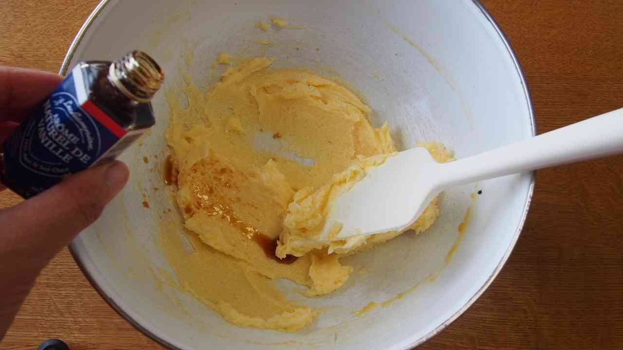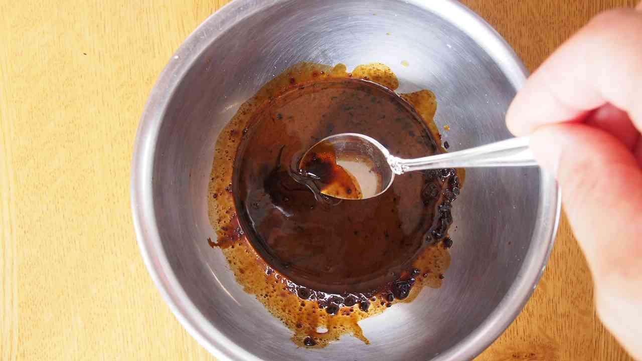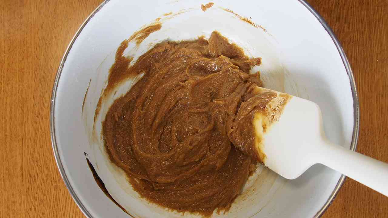 サブレココ、いちごクッキーと同様に、バターにグラニュー糖を加えて卵と合わせたら、準備しておいたインスタントコーヒーをお湯で溶いたものを加える。- 2