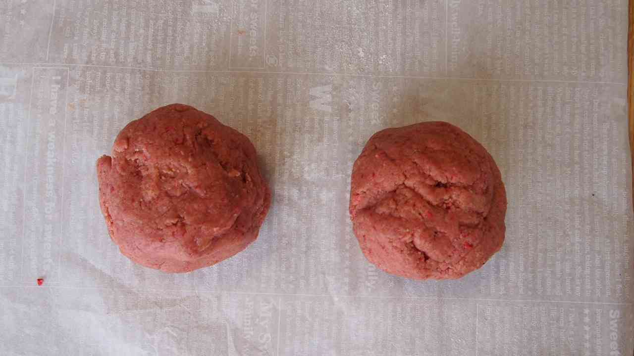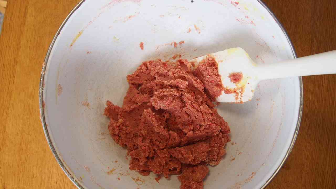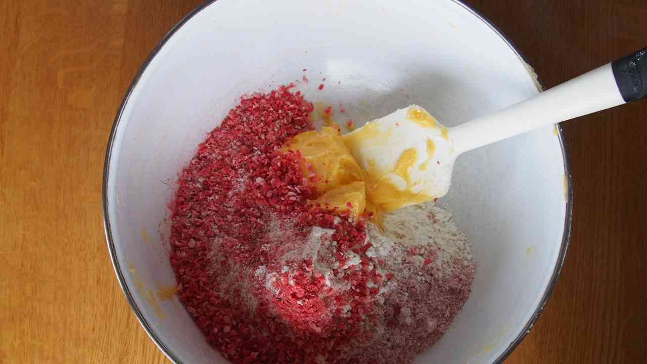 ふるった粉類といちごのフリーズドライフレークを加える。- 5