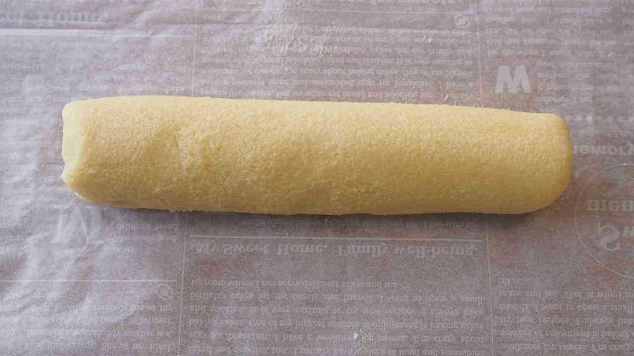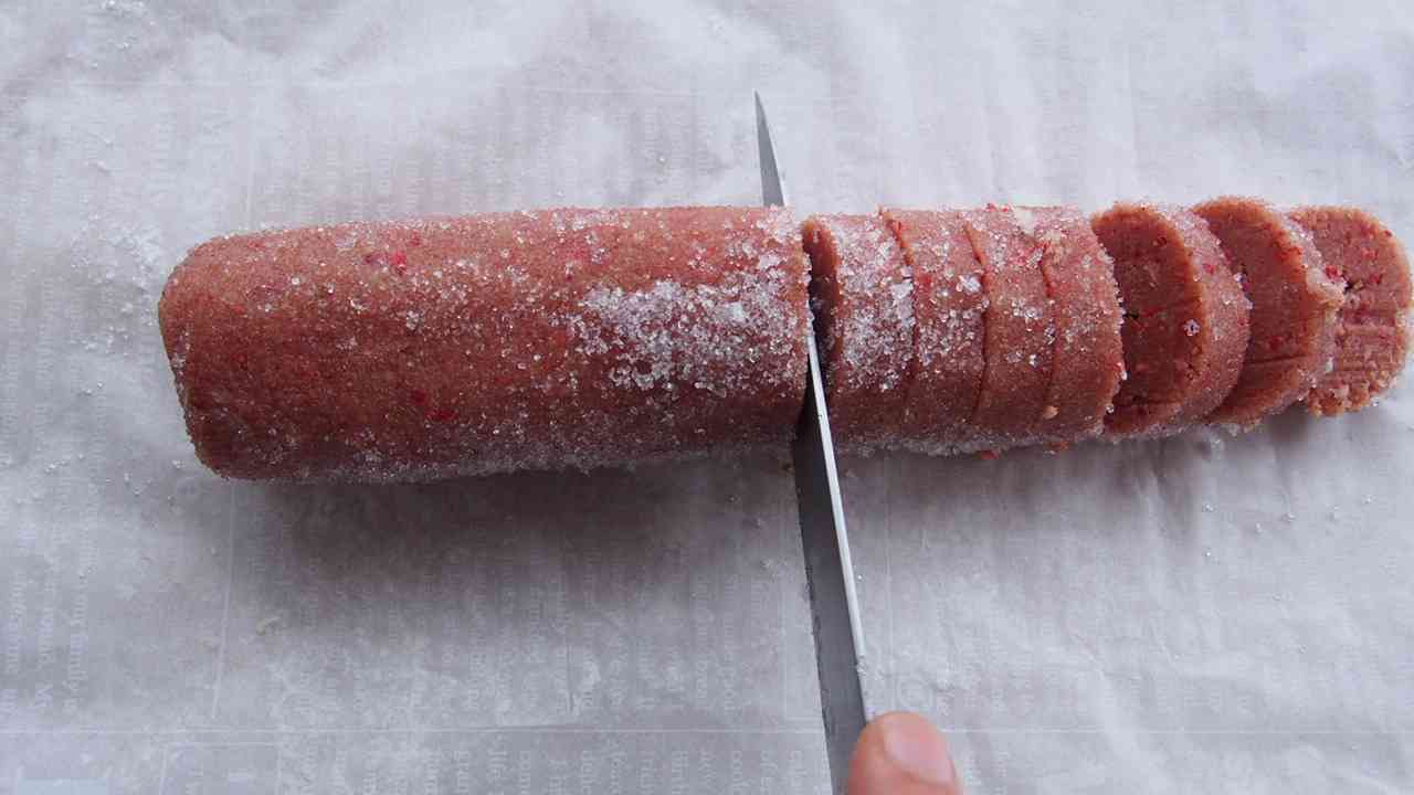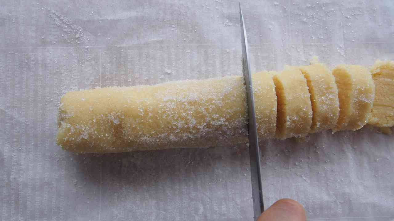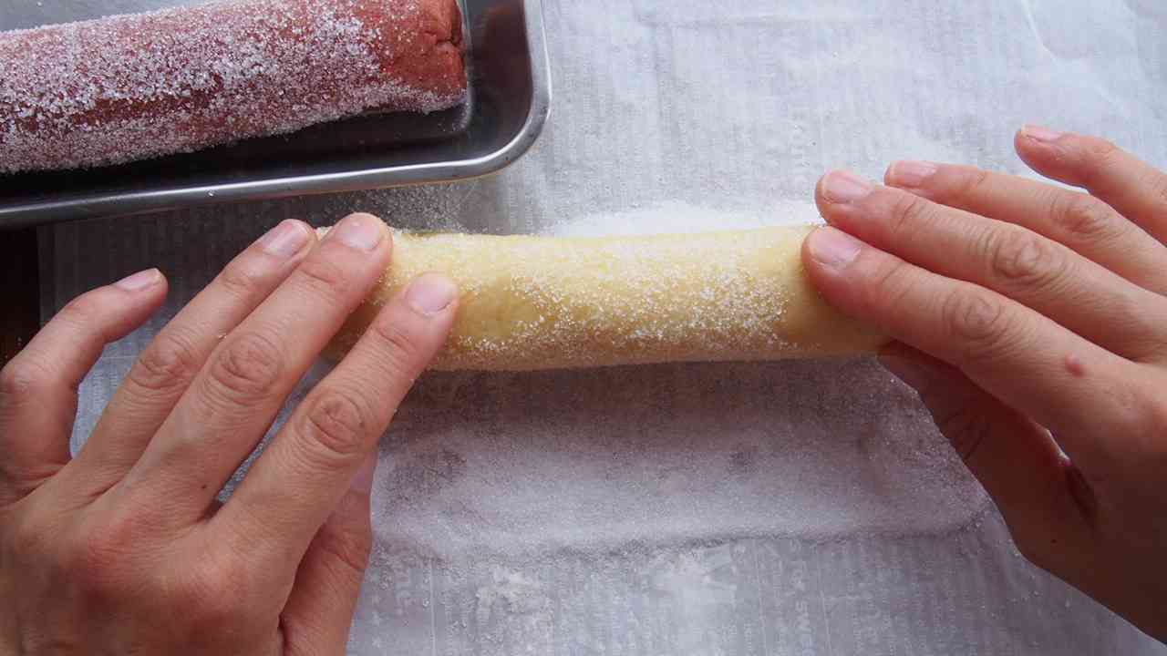 紙の上などにグラニュー糖をたっぷり敷き、冷やし固まったクッキー生地の周りにまぶしていく。- 2