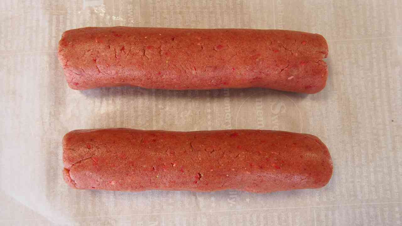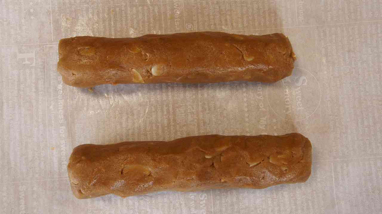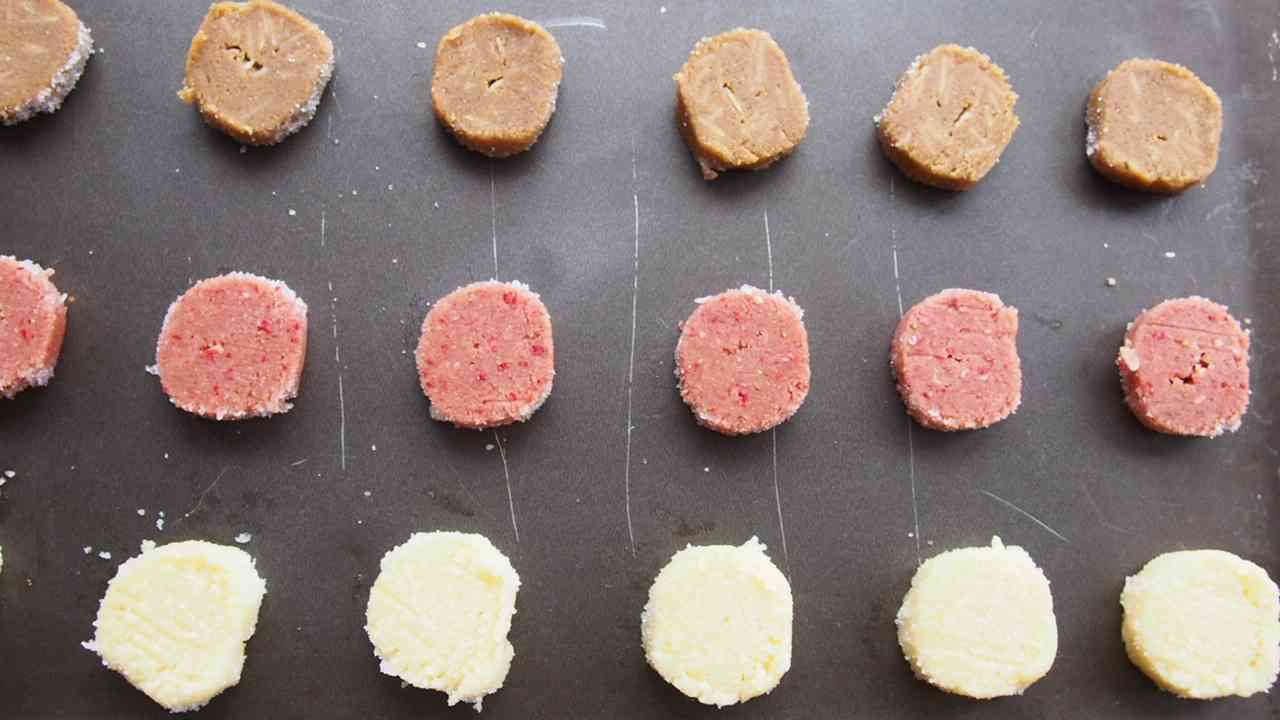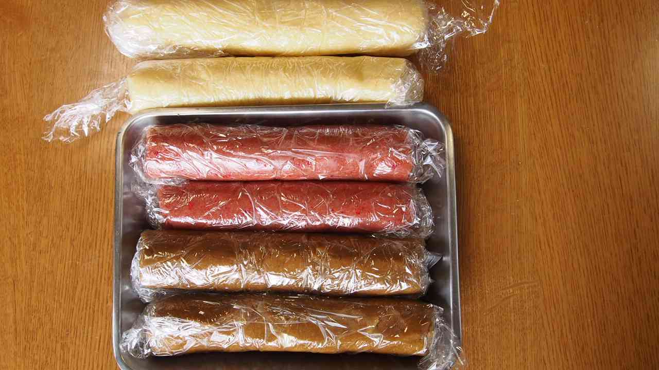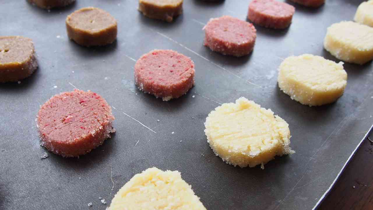 紙の上などにグラニュー糖をたっぷり敷き、冷やし固まったクッキー生地の周りにまぶしていく。- 2
