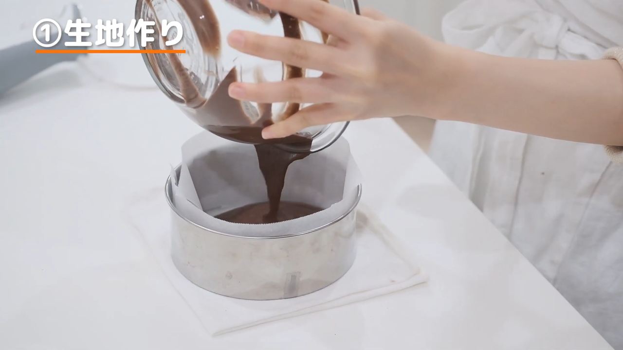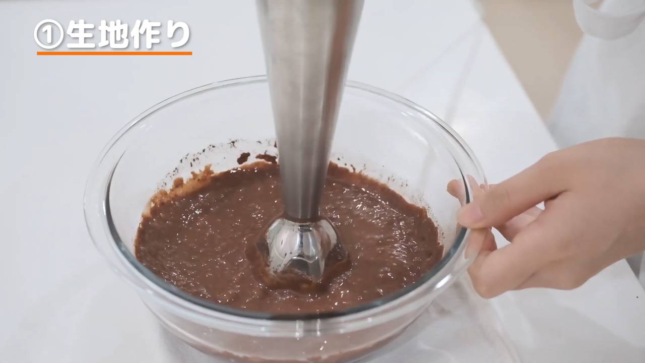 ボウルに絹ごし豆腐、卵、ココアパウダー、甘味料を入れてハンドブレンダーでなめらかになるまでよく混ぜる。- 3